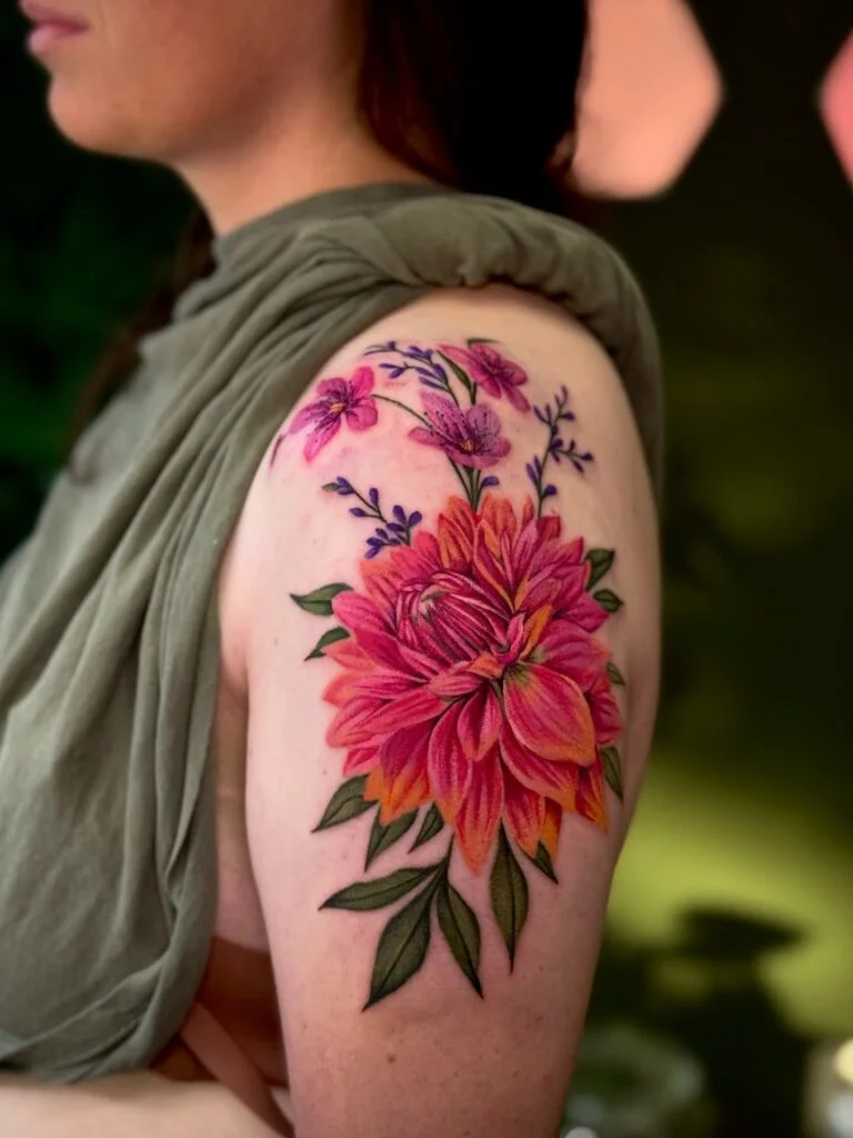 This tattoo showcases a stunning pink dahlia with hints of orange and magenta, creating a bold burst of color on the upper arm.
