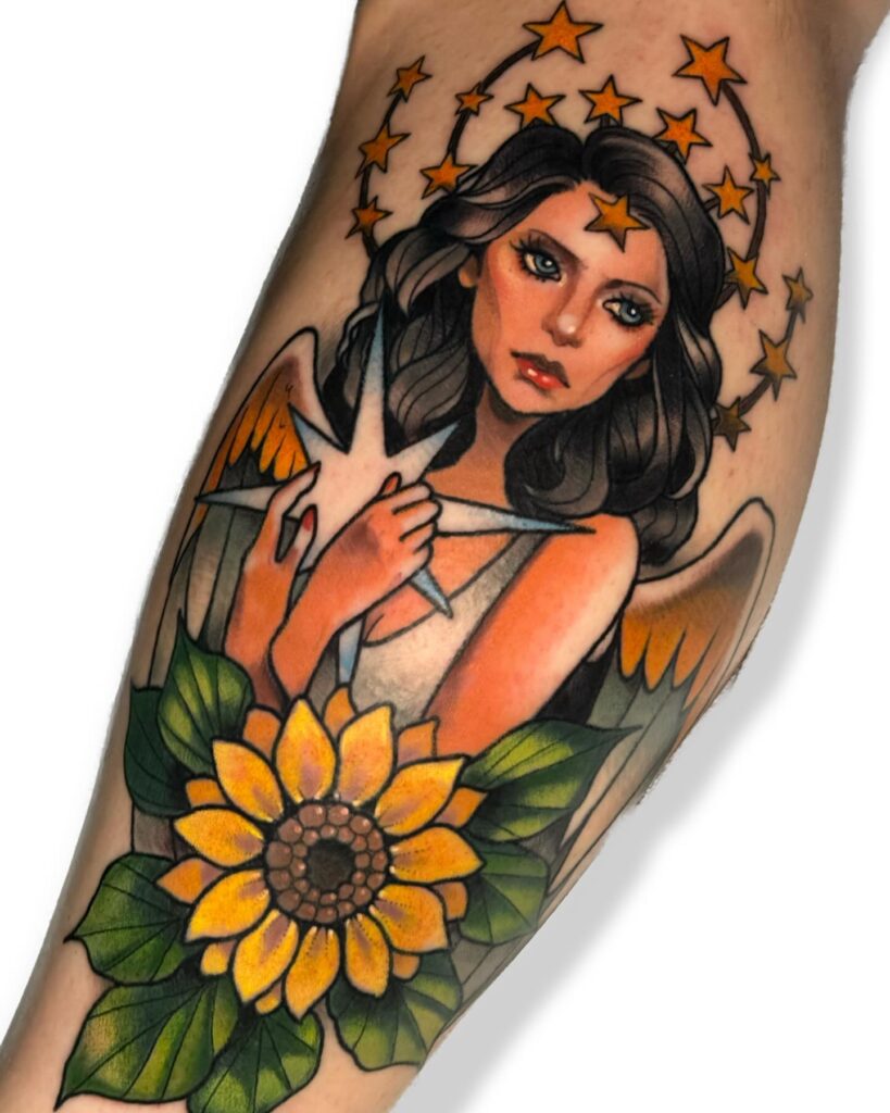 Angel and Sunflower Tattoo with Golden Stars