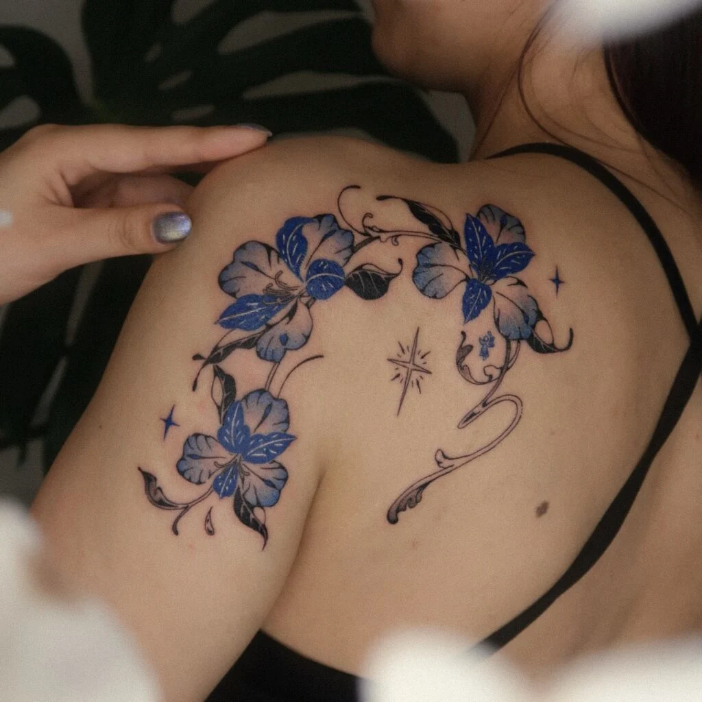 This tattoo features three blue flowers gracefully extending across the shoulder and upper back.