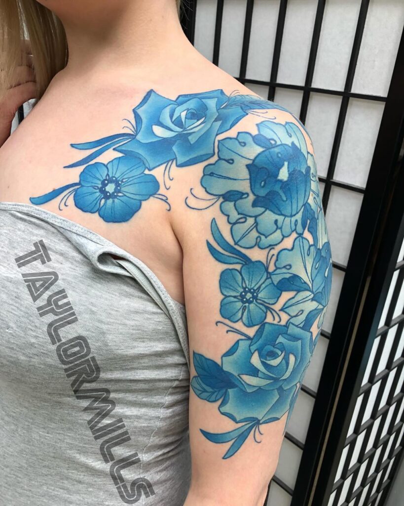 This tattoo features a captivating mix of blue roses and blossoms flowing from the shoulder to the upper arm.