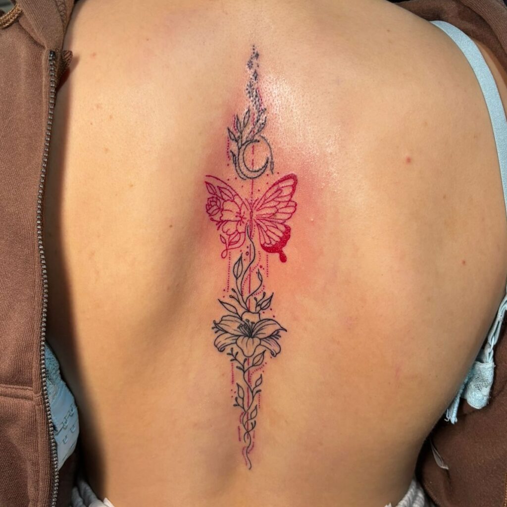 Butterfly and Moon Floral Spine Tattoo