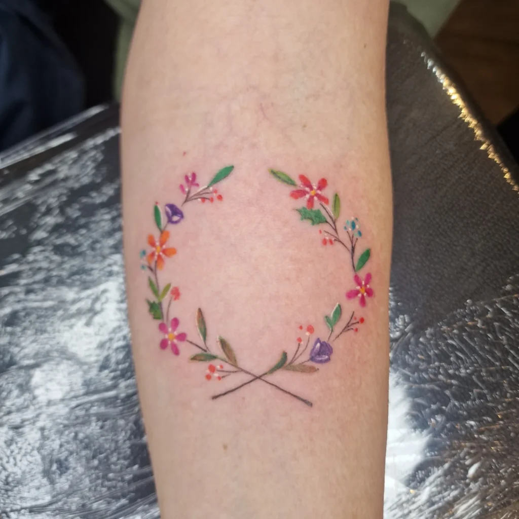 This tattoo forms a delicate circular wreath made of tiny, colorful flowers and leaves.