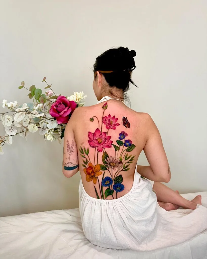 This stunning back tattoo features an arrangement of vibrant flowers blooming along the spine, each in striking detail and color.