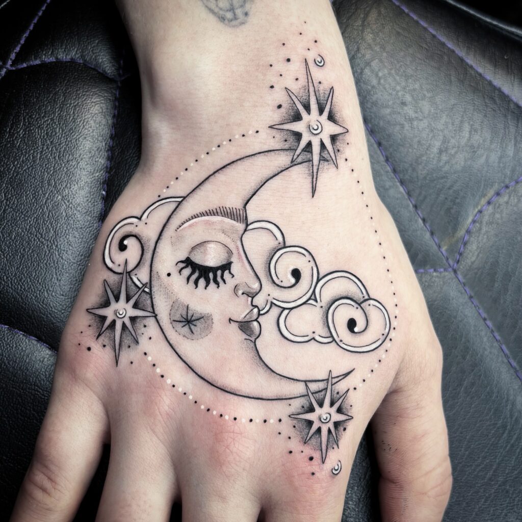 Crescent Moon and Stars Hand Tattoo