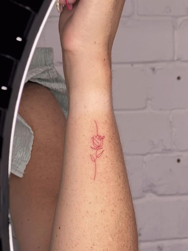 Fine Line Red Rose Tattoo on Forearm
