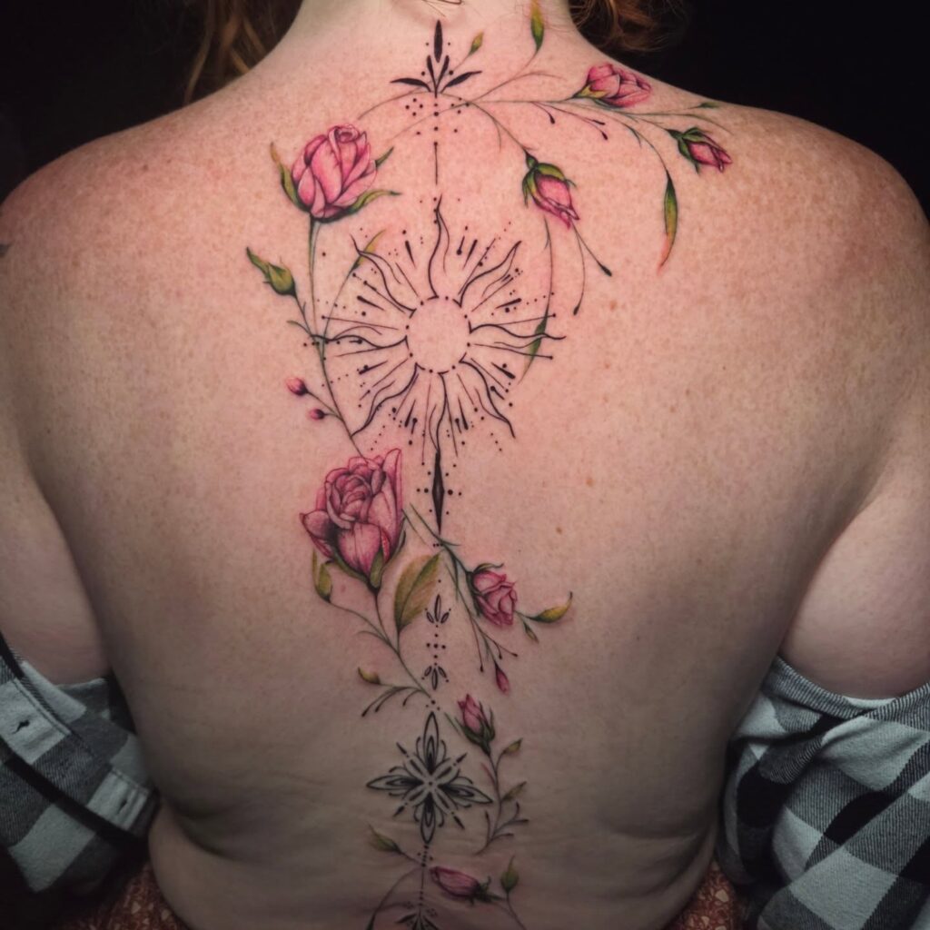 Floral Spine Tattoo with Radiant Sun Design