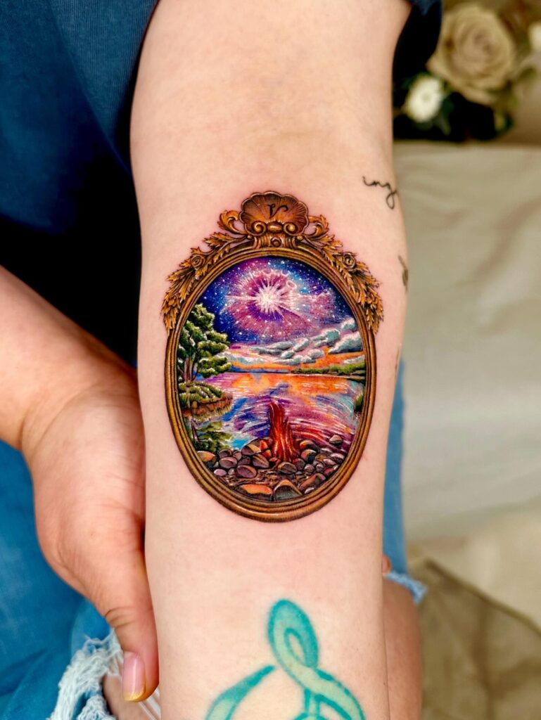 The detailed colors bring the landscape to life, blending emotion and artistry. It’s a deeply personal tattoo that celebrates connection, memory, and the cosmic ties of family.