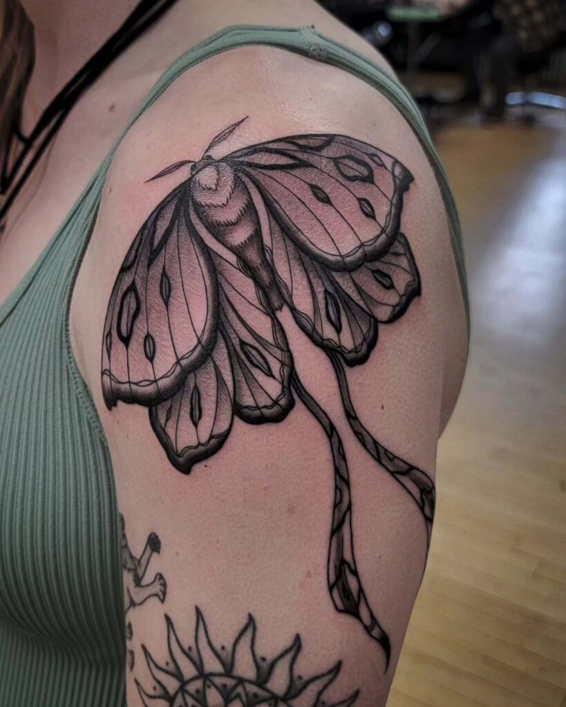 This tattoo features a beautifully detailed luna moth spread gracefully across the shoulder.