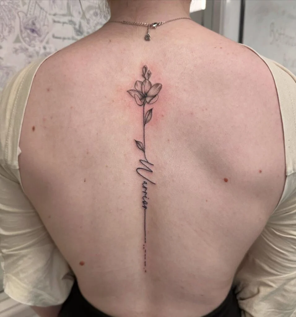 Minimalist Flower Spine Tattoo with “Warrior” Script
