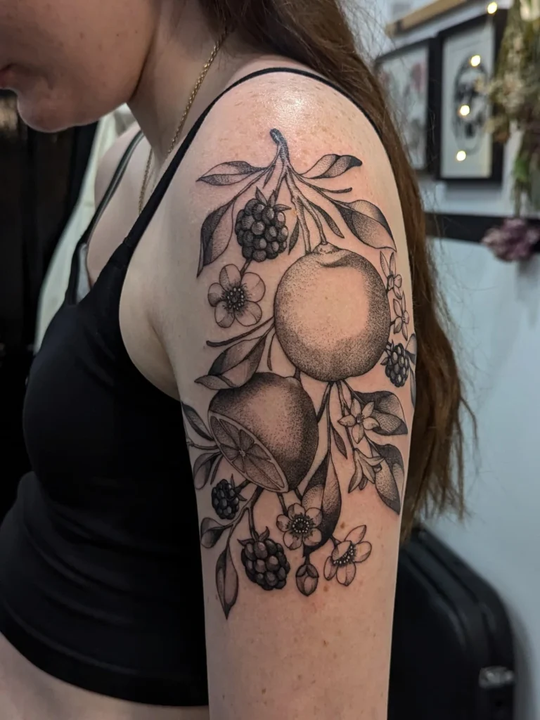 This tattoo features a detailed arrangement of oranges, blackberries, and delicate blossoms, all rendered in fine black and gray shading.