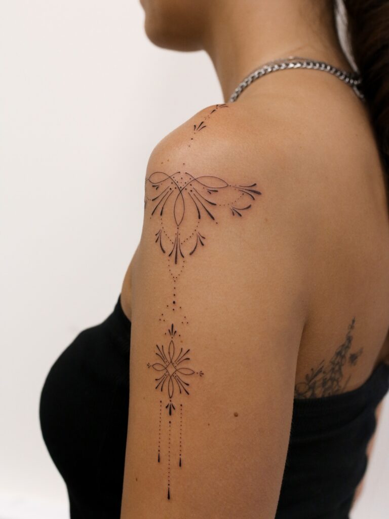 Ornamental Shoulder Tattoo with Fine Line Details