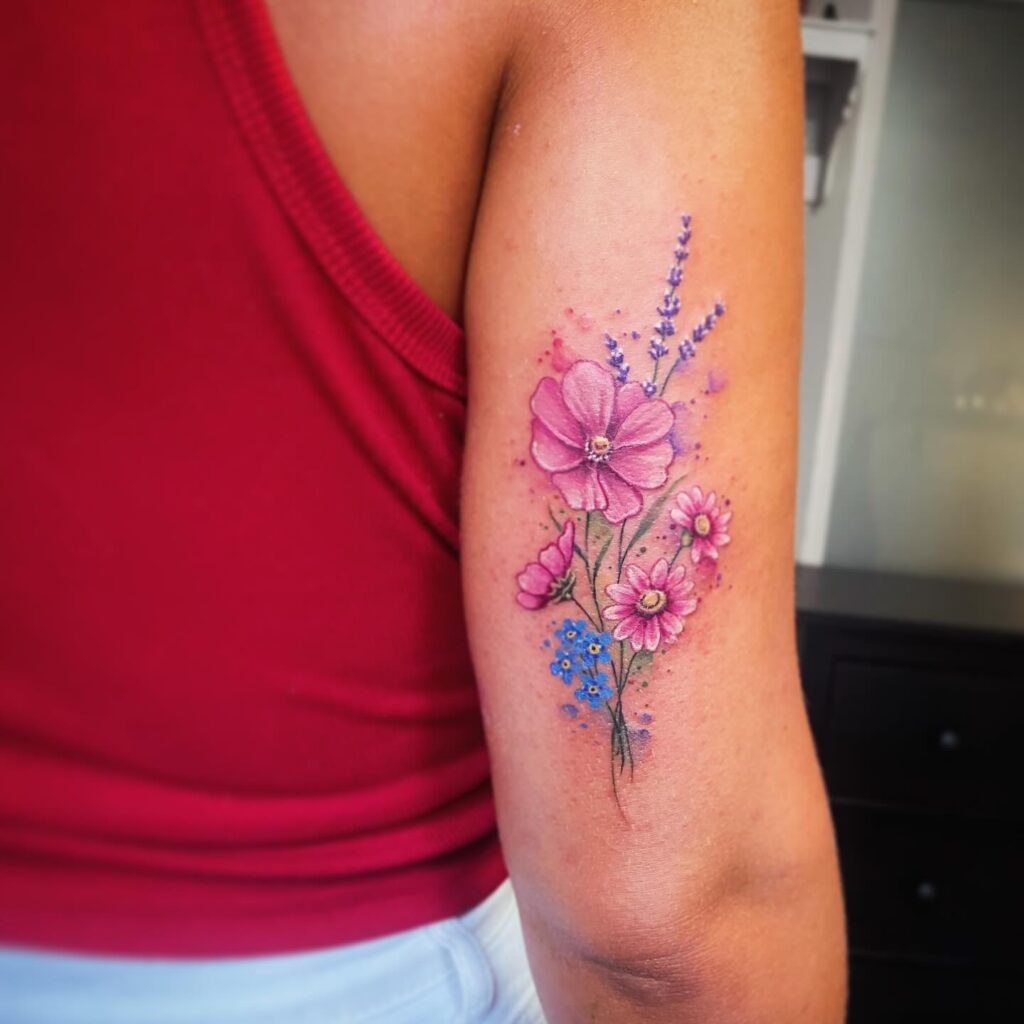 This tattoo features a delicate bouquet of pink and blue wildflowers inked on the upper arm.