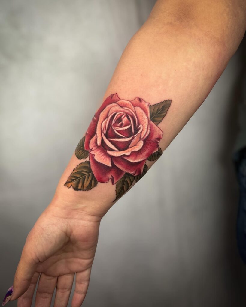 The placement allows the rose to follow the arm’s natural curve, making it visually striking from any angle. It’s a timeless and graceful tattoo symbolizing love, beauty, and emotional strength.