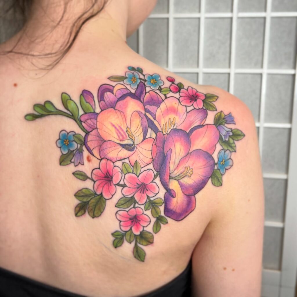 Vibrant Floral Shoulder Blade Tattoo