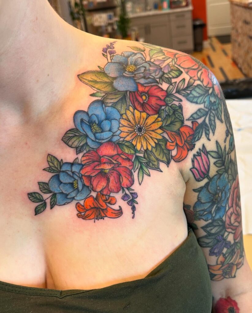 Vibrant Floral Shoulder and Chest Tattoo