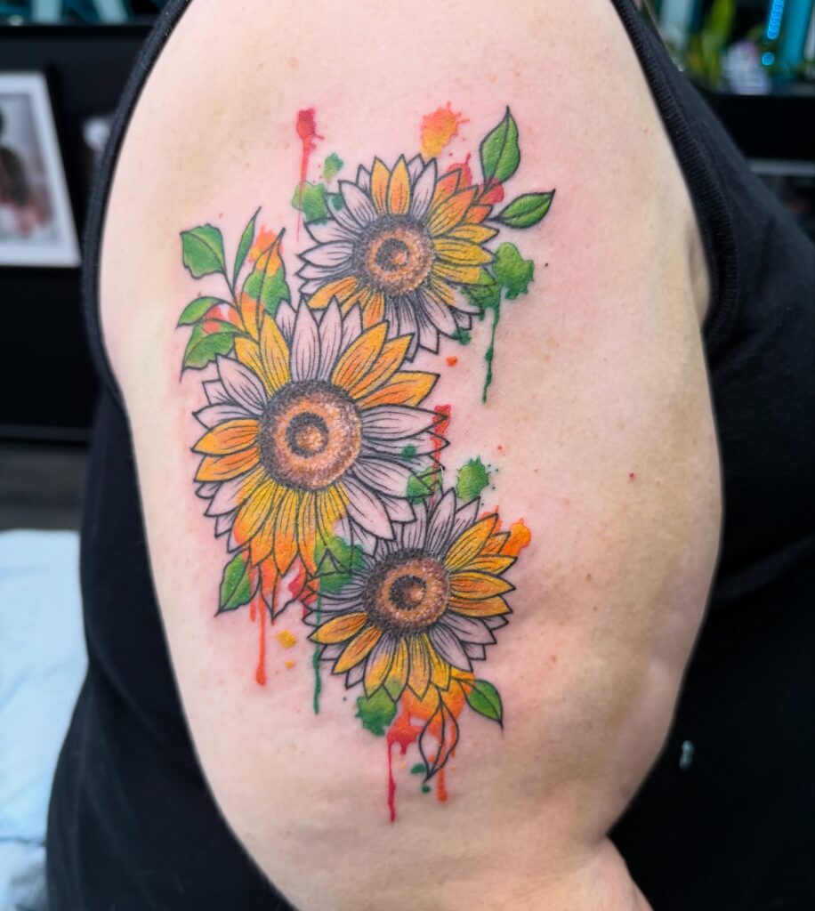 The watercolor drips give the design a creative, free-spirited touch. It’s a joyful and artistic tattoo that radiates positivity, warmth, and a love for nature’s brightness.