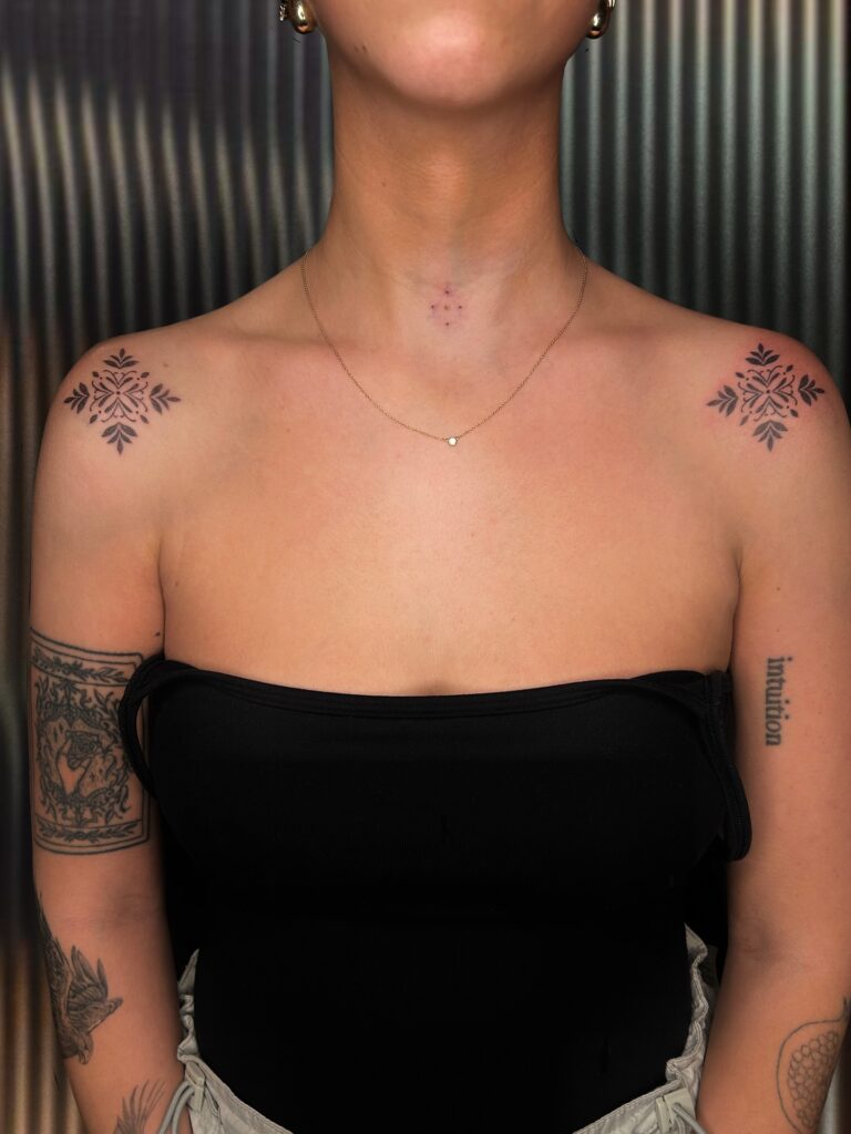 This tattoo set features two symmetrical ornamental designs hand-poked on each shoulder.