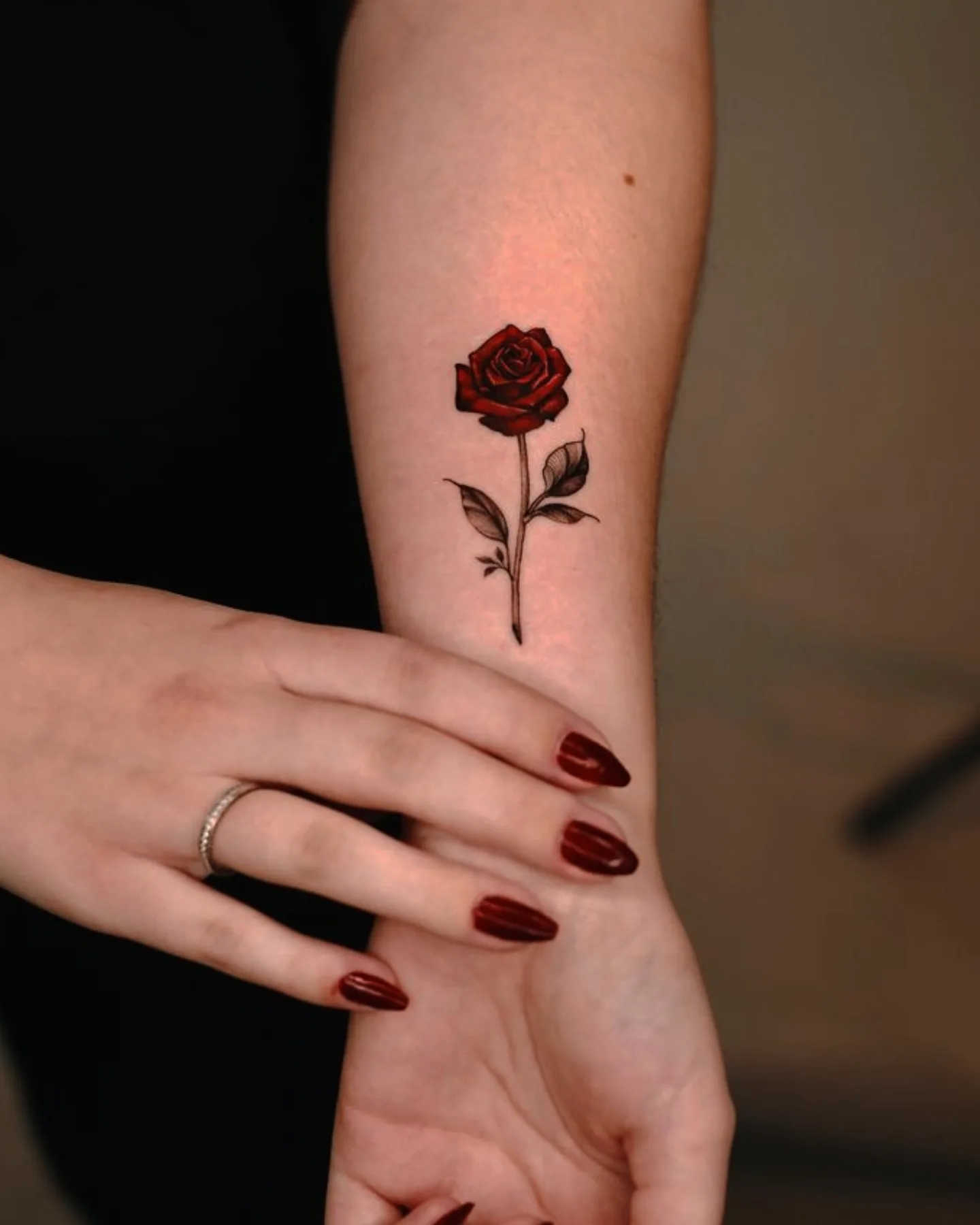 This tiny realistic rose arm tattoo is subtle and feminine, offering a soft pop of color without feeling bold. The petals are shaded in deep red tones, giving the flower a classic look that feels romantic. The stem is thin and delicate, accented by small leaves that add balance without taking attention away from the bloom.