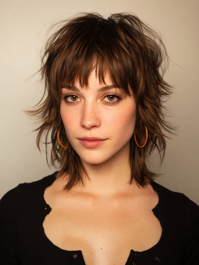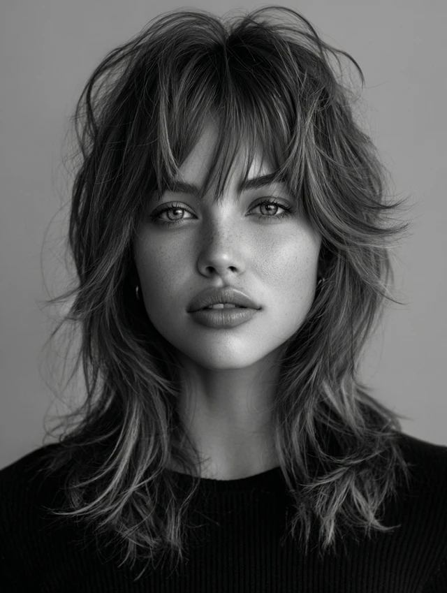 Tousled shaggy wolf cuts create a messy, carefree texture while keeping bangs prominent. Works for oval, round, and heart-shaped faces. Medium to thick hair responds best, enhancing playful volume and movement.