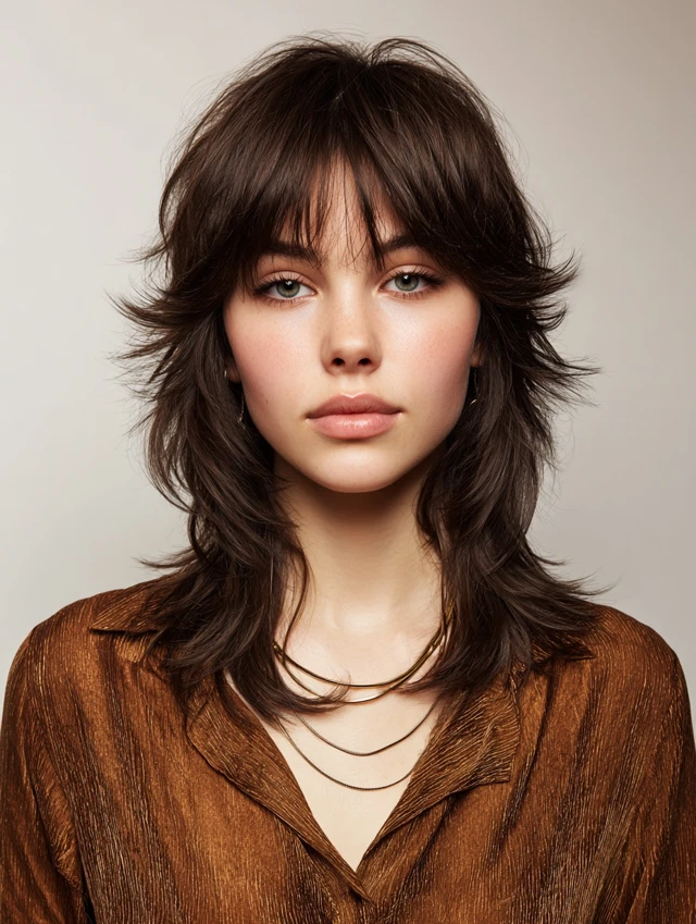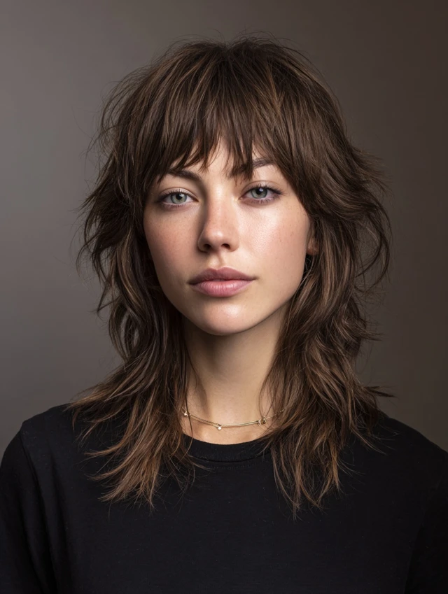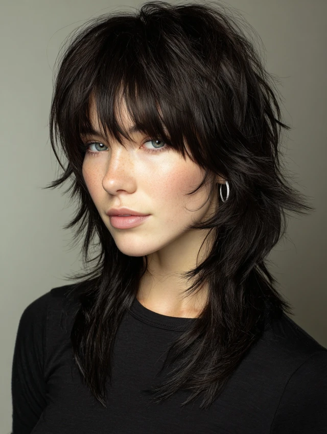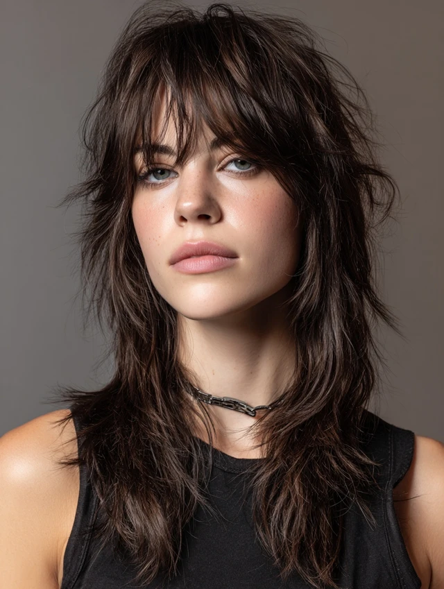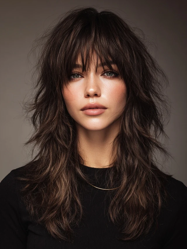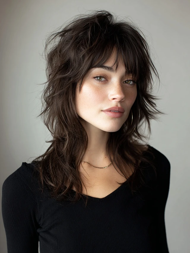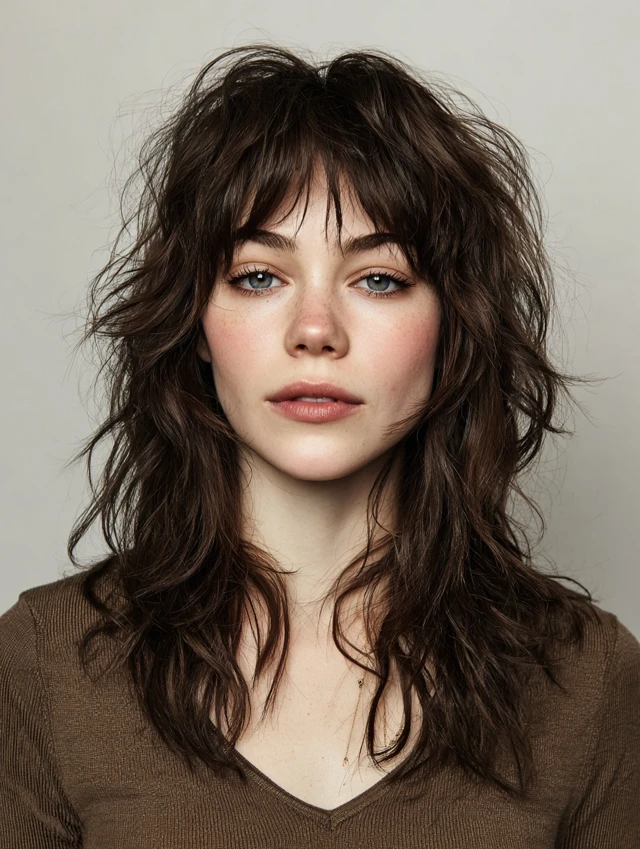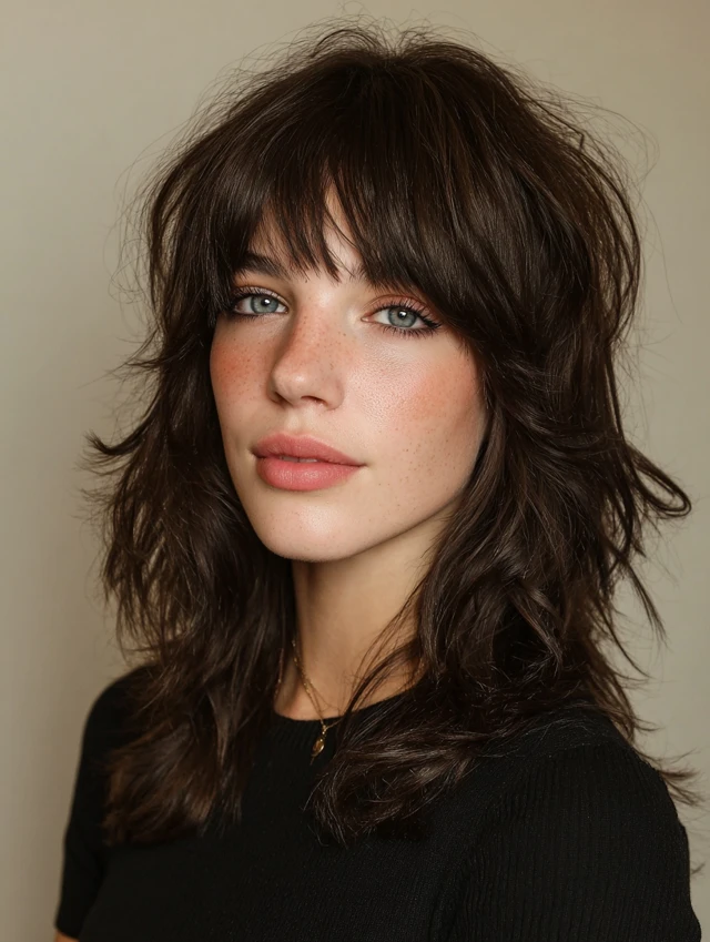 The shaggy wolf cut with bangs combines textured layers with a messy, lived-in look and face-framing fringe. This haircut gives volume at the crown, jagged ends for movement, and bangs that soften the forehead. It works best on medium to thick hair and suits straight, wavy, or slightly curly textures. Ideal for oval, round, and heart-shaped faces, it balances edgy style with feminine softness. This low-maintenance cut fits casual, creative, or fashion-forward lifestyles while remaining easy to style daily.