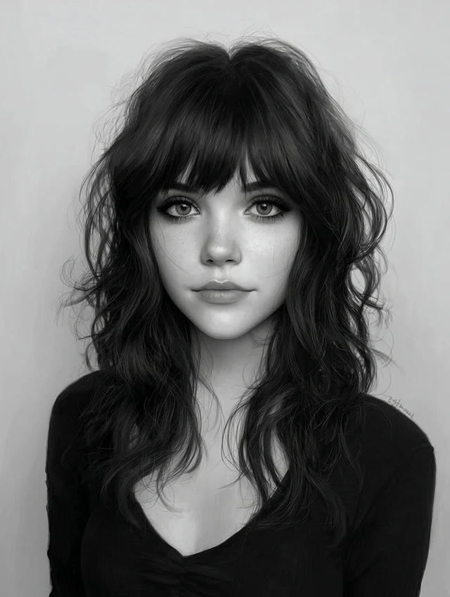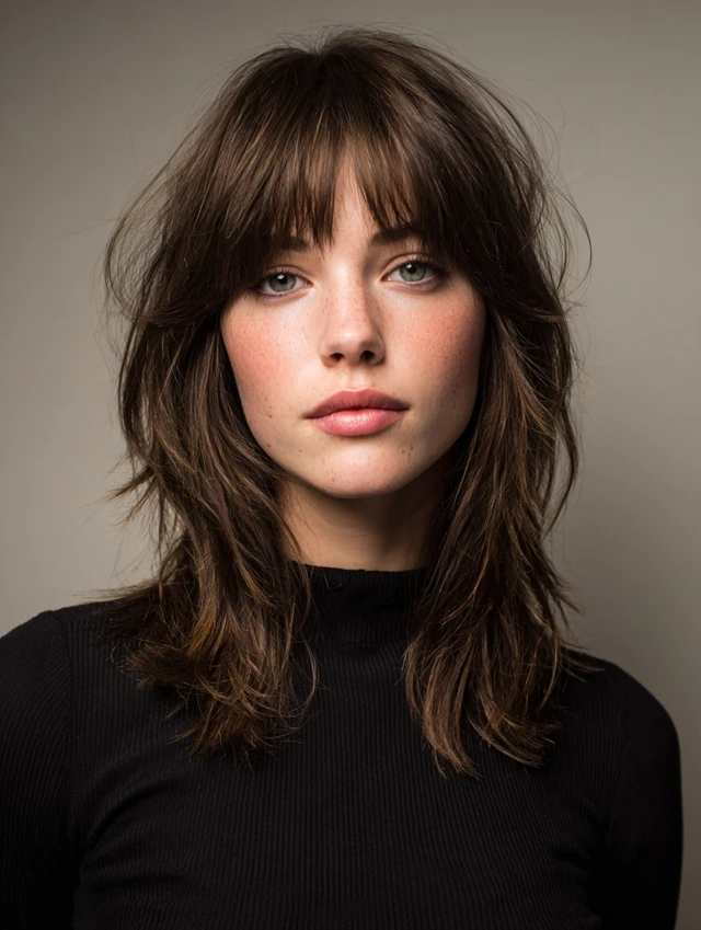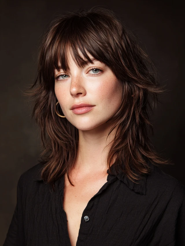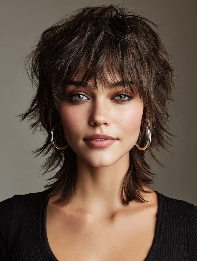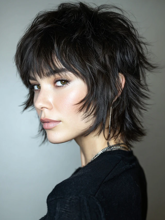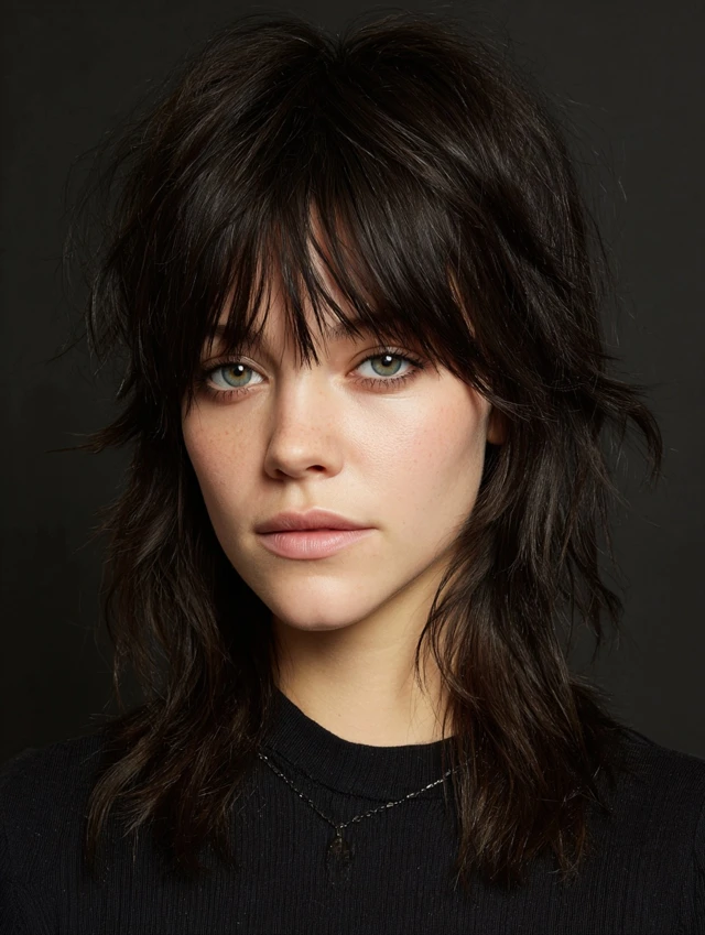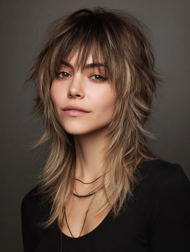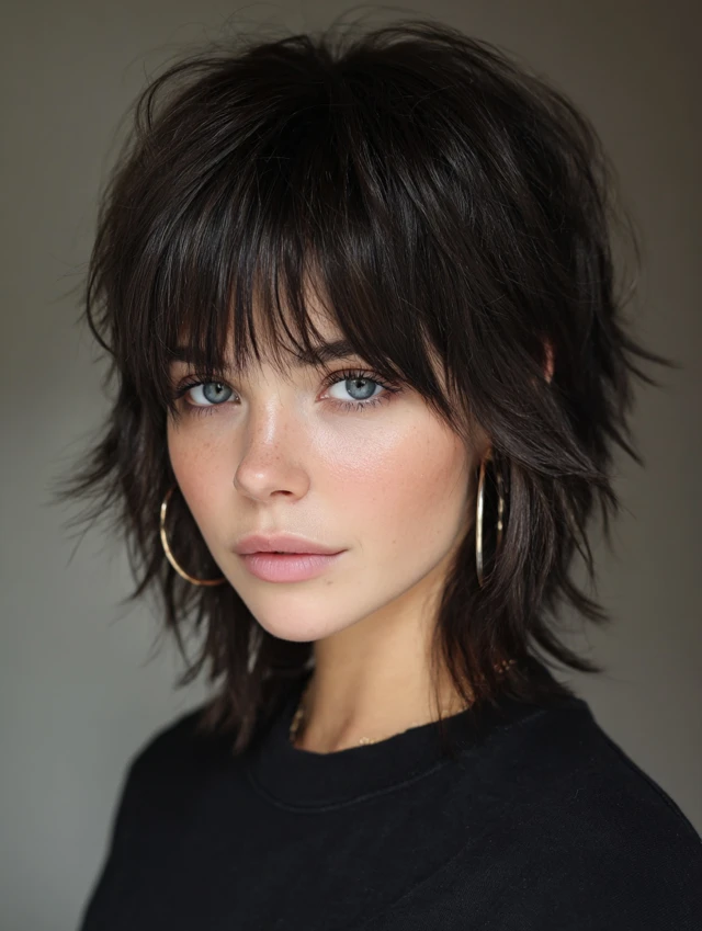 The shaggy wolf cut with bangs combines textured layers with a messy, lived-in look and face-framing fringe. This haircut gives volume at the crown, jagged ends for movement, and bangs that soften the forehead. It works best on medium to thick hair and suits straight, wavy, or slightly curly textures. Ideal for oval, round, and heart-shaped faces, it balances edgy style with feminine softness. This low-maintenance cut fits casual, creative, or fashion-forward lifestyles while remaining easy to style daily.