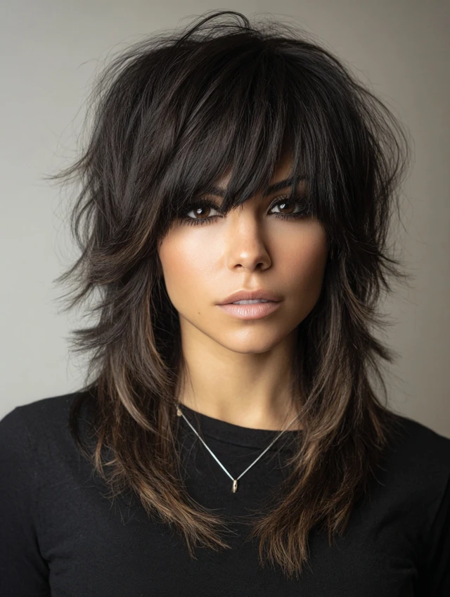 This style features layered crown volume, jagged ends, and straight or slightly textured bangs. Works well for oval, round, and heart-shaped faces. Medium to thick hair holds layers naturally and shows fringe clearly.