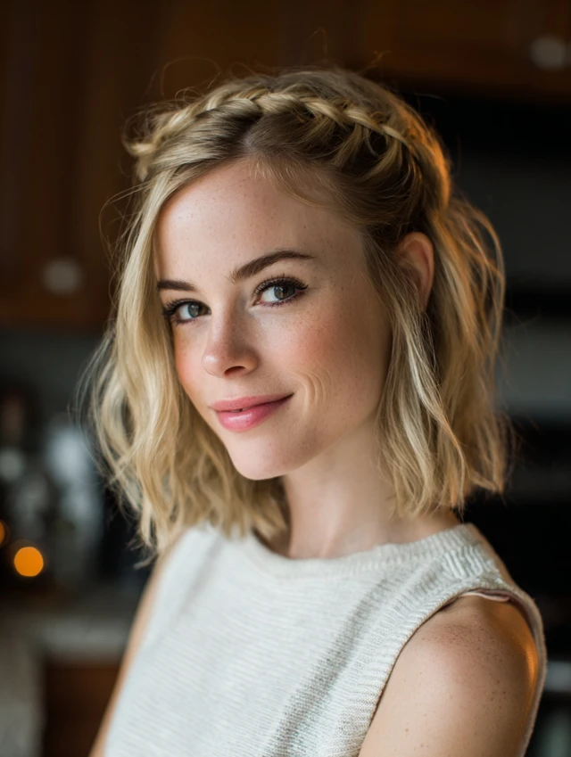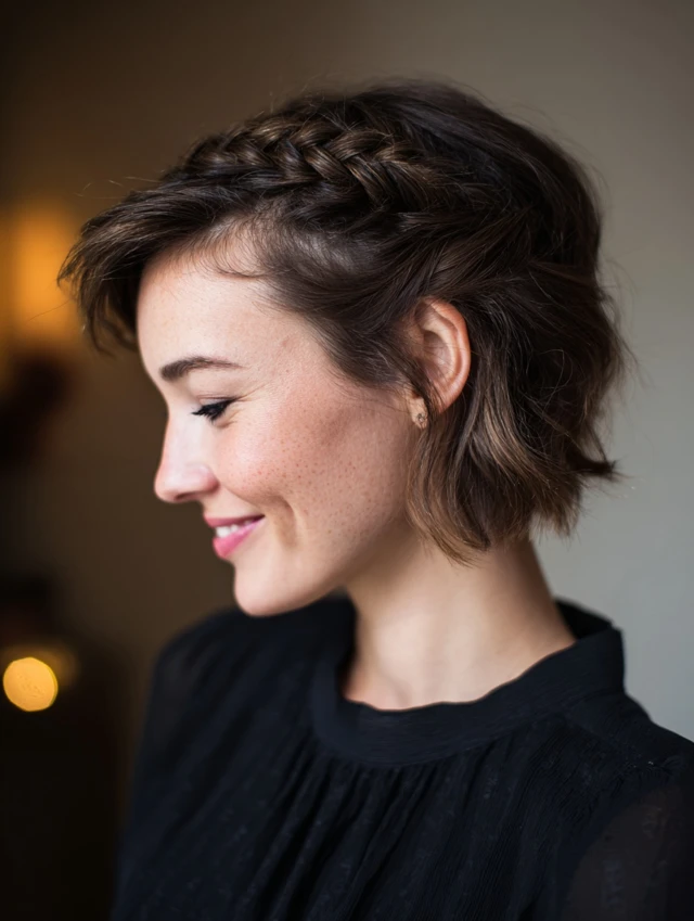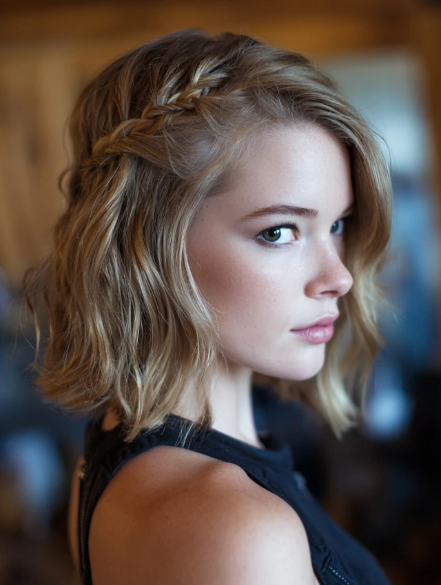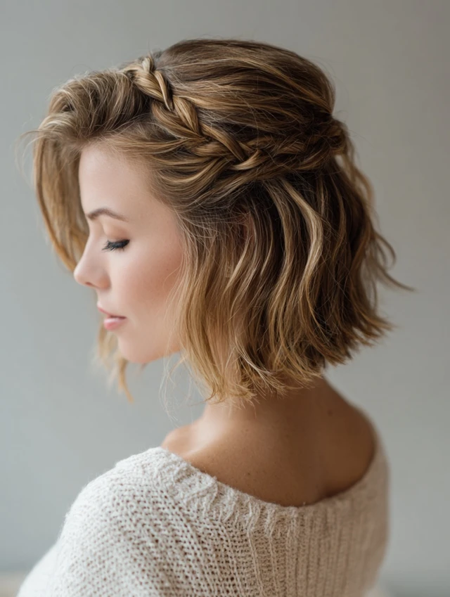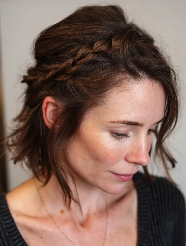 This style suits oval and heart-shaped faces. Best for short to medium-length hair. Styling involves simple braiding of the pulled-back section and securing with pins or elastic for a neat, polished look.