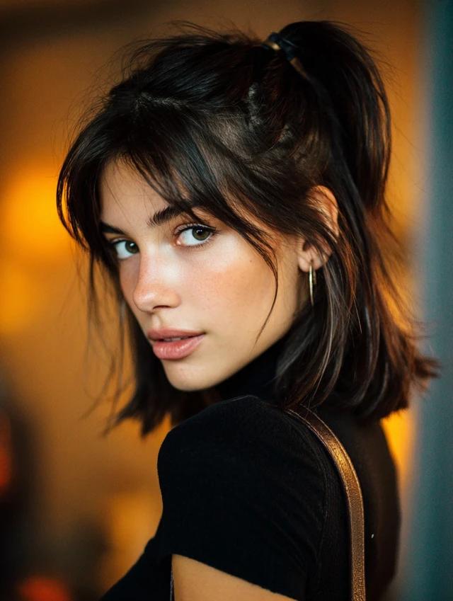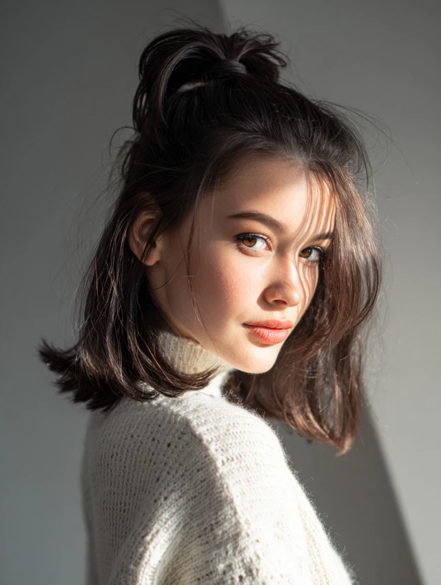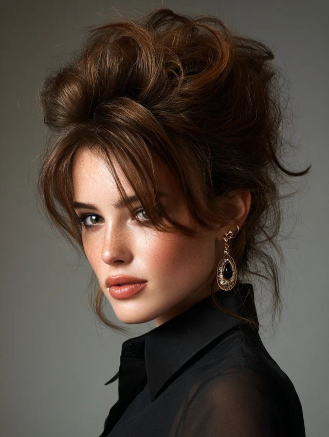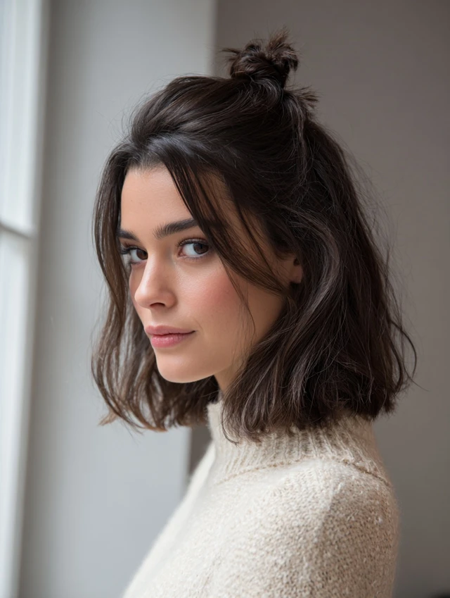 This style suits round, oval, and square faces. Ideal for straight or wavy hair. Styling involves gathering the top section and securing with a small hair tie, creating volume and lift at the crown.