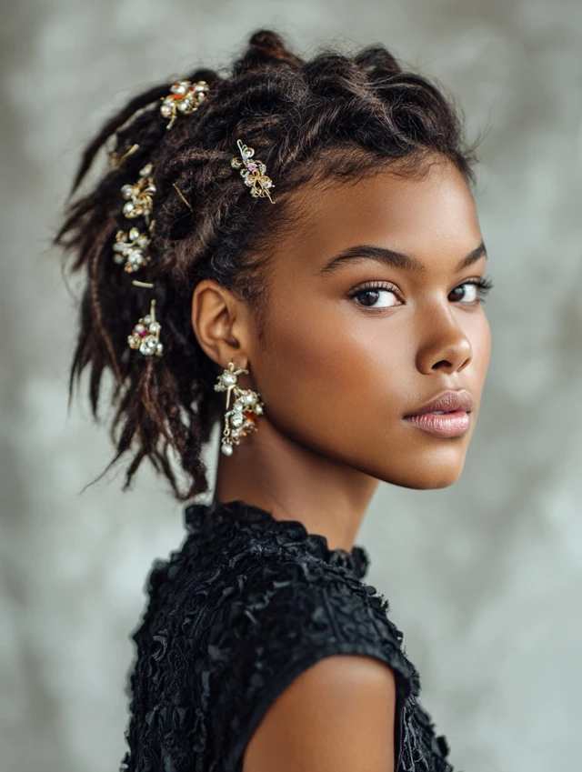 This variation combines twisted or braided sections with decorative pins, clips, or barrettes, adding personality and flair to the hairstyle.