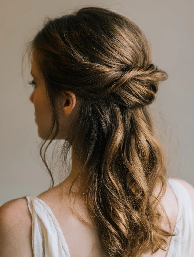 The twisted half up style twists small sections from each side of the head and secures them at the back, creating a soft, elegant effect.