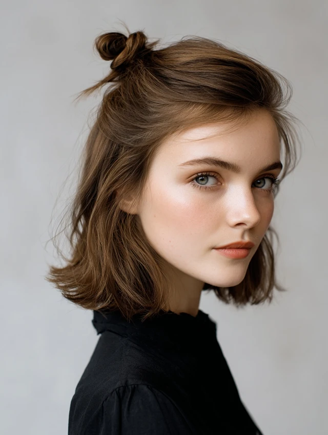 Short half up half down hairstyles are perfect for women who want a versatile, low-maintenance style with an elegant or playful touch. From simple knots and mini ponytails to braided, twisted, or accessorized variations, these hairstyles add volume, movement, and dimension to short hair.