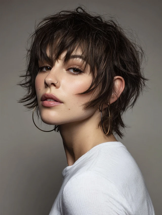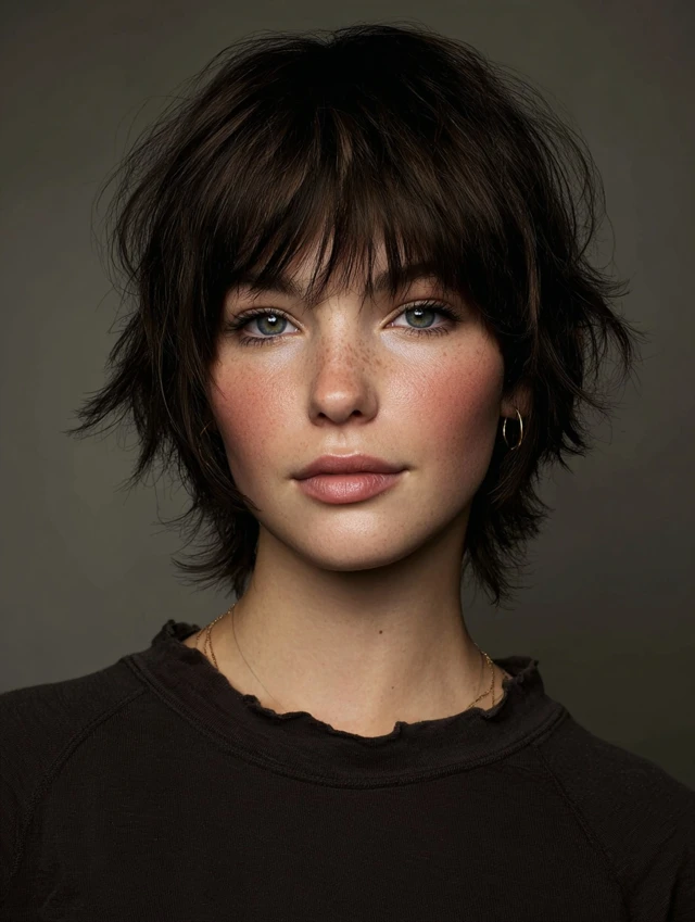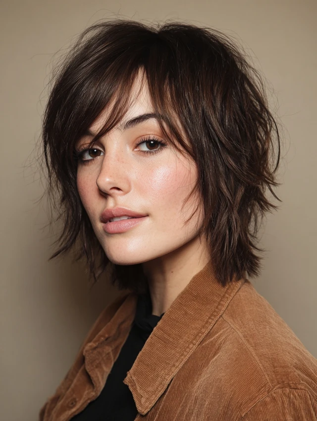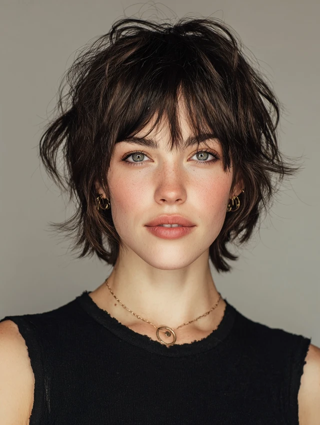 Tousled short shags create a carefree, messy look with textured bangs. Works for oval, round, and heart-shaped faces. Medium to thick hair responds best, as tousling enhances natural movement and volume.