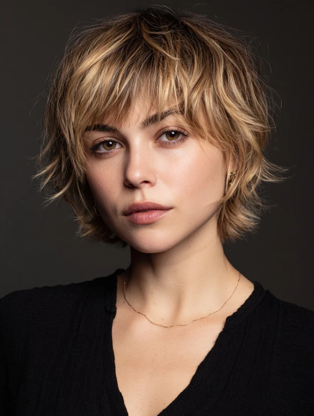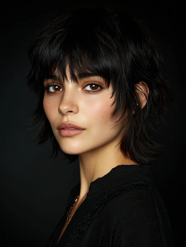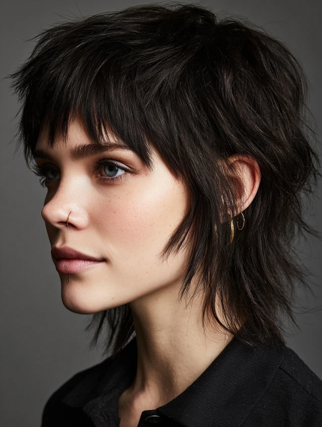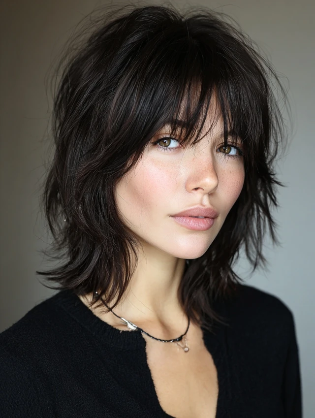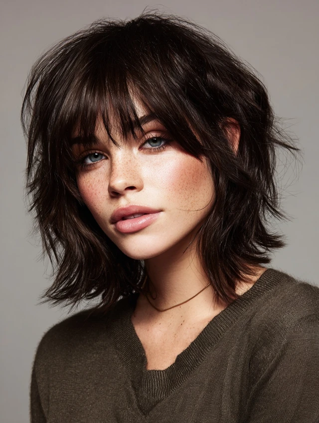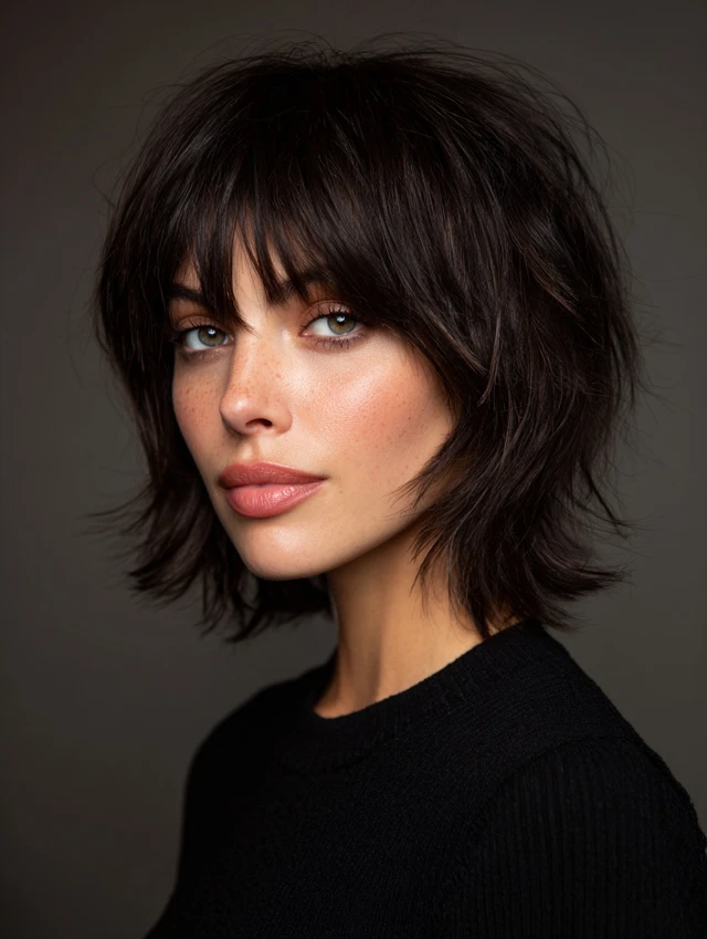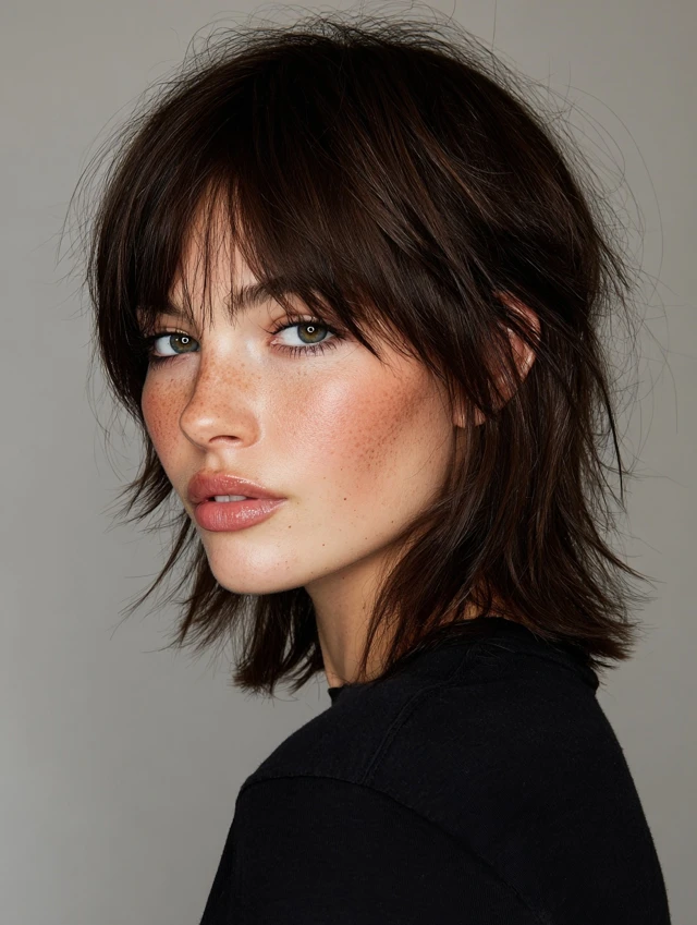 The short shag with bangs is a textured, layered haircut that adds movement, volume, and effortless edge. It works perfectly for women who want a modern, playful style with minimal maintenance. This haircut suits straight, wavy, or slightly curly hair and complements medium to thick hair types. Bangs soften the forehead while layered ends frame the face. Ideal for oval, round, and heart-shaped faces, this style works in casual, professional, or creative settings, offering both versatility and personality.