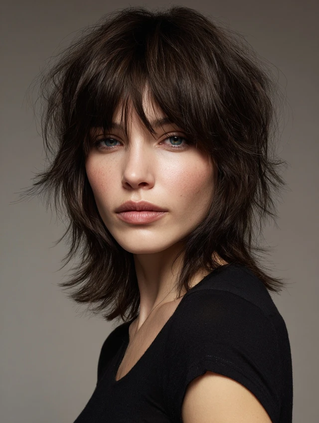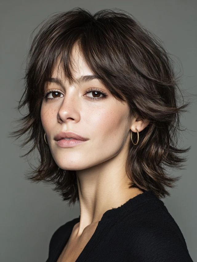Layered short shags feature jagged, choppy layers throughout with soft or textured bangs for a modern, edgy look. Works well for oval and round faces, softening features while adding playful volume. Medium to thick hair responds best.
