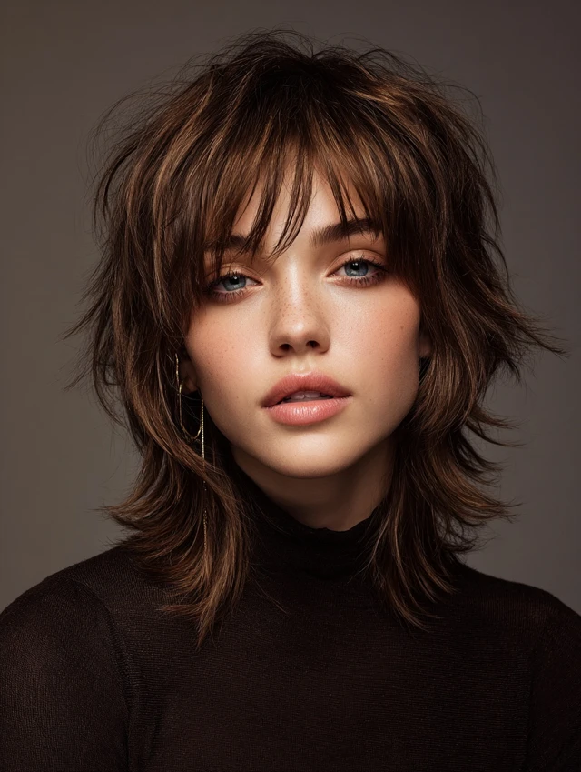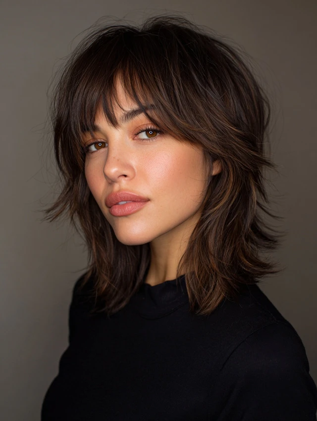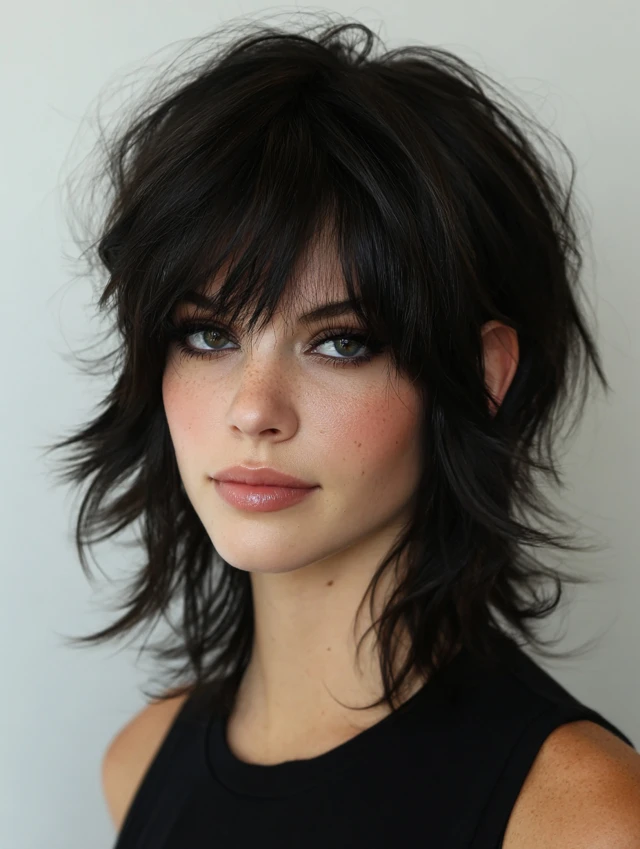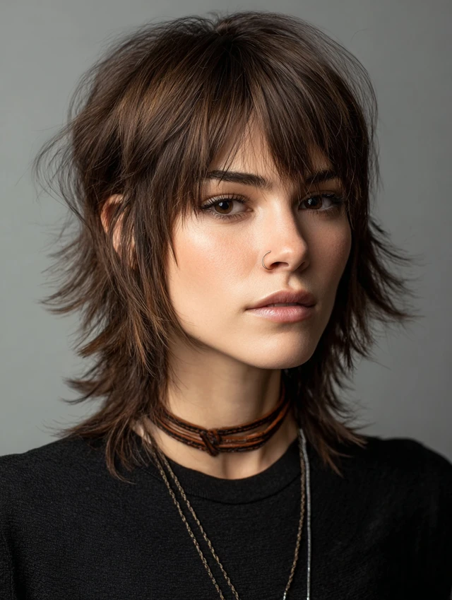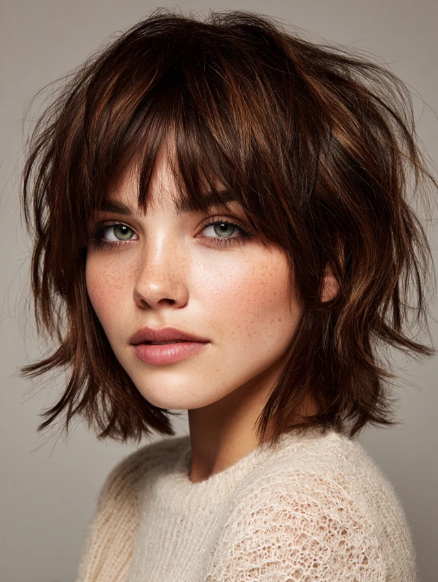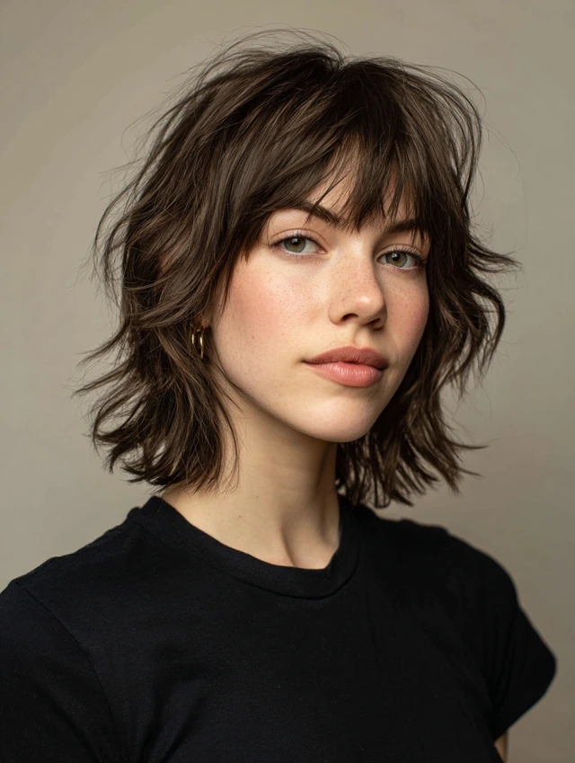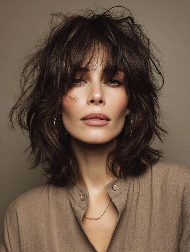 To nail this look, ask your stylist for choppy layers at the crown, longer textured ends, and soft curtain bangs. Use a light mousse, cream, or texturizer to enhance texture. Air-dry or diffuse lightly for volume and movement. Regular trims every 6–8 weeks keep the cut fresh and maintain the perfect balance between edgy layers and soft bangs.