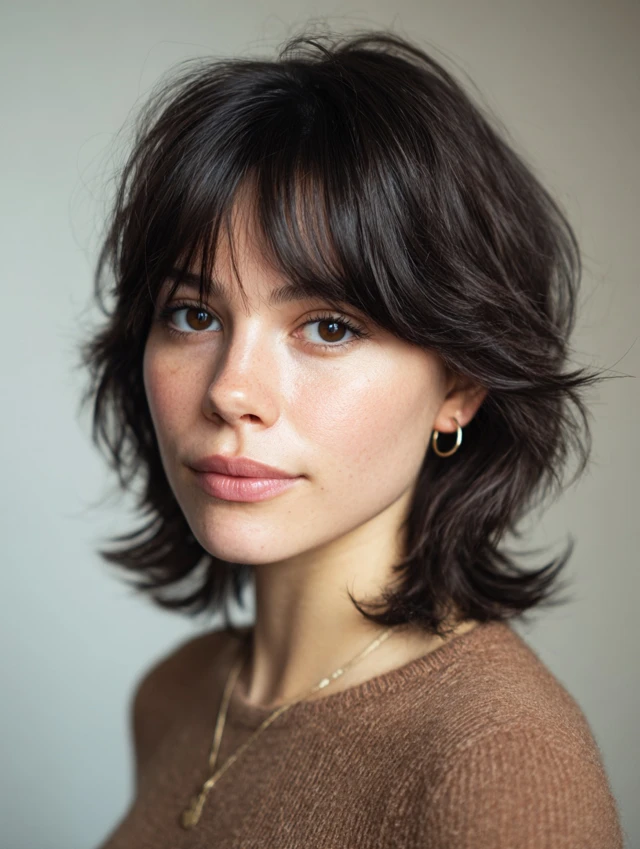 Layered short wolf cuts with curtain bangs feature shorter crown layers and longer ends that flow naturally. Works well for oval and round faces, softening features while keeping volume at the top. Medium to thick hair responds best.