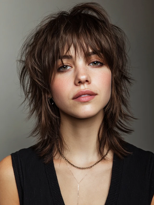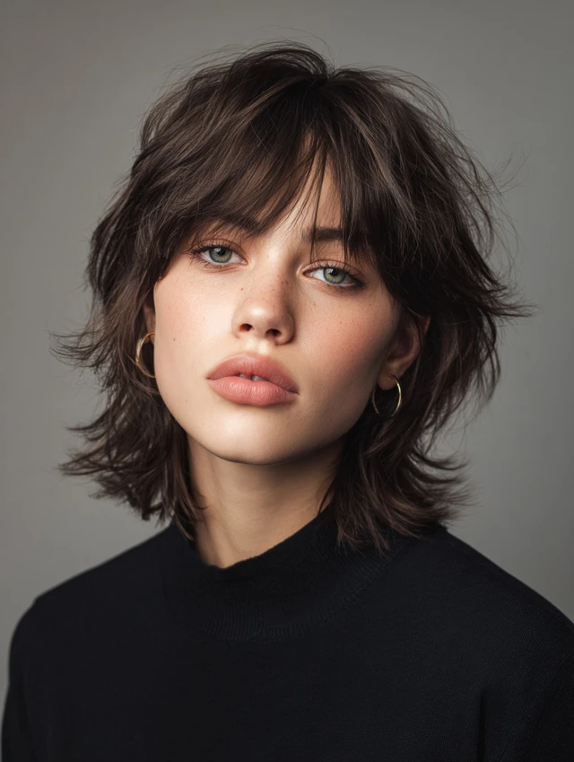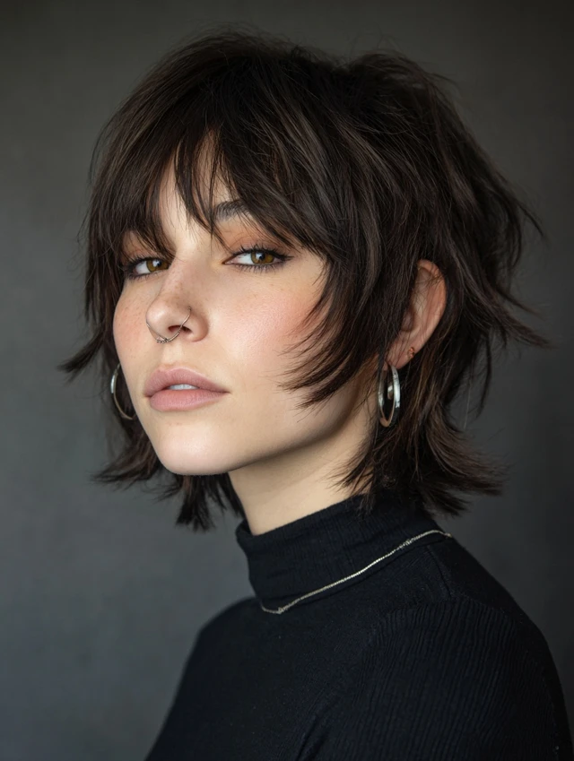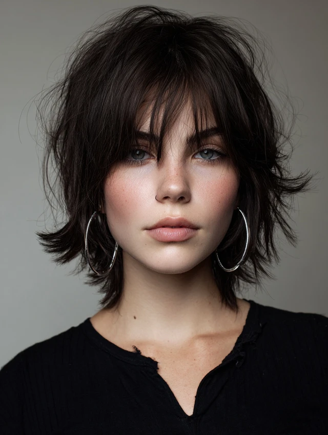 Textured short wolf cuts combine jagged, choppy ends with soft curtain bangs for an edgy yet feminine look. Works for oval, round, and square faces. Medium to thick hair responds best, adding movement and volume.