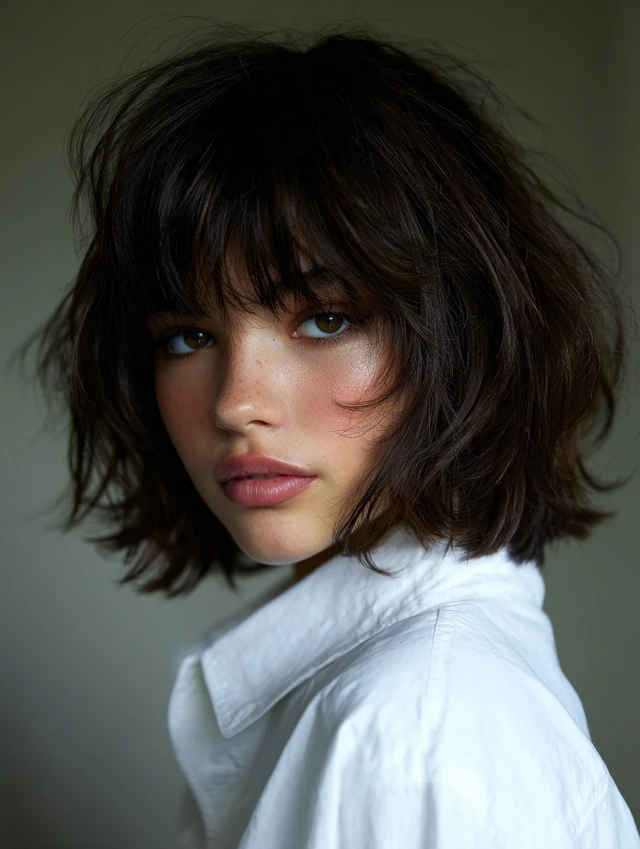 Tousled short wolf cuts create a messy, carefree texture while maintaining curtain bangs that frame the face. Works well for oval, round, and heart-shaped faces. Medium to thick hair responds best to tousled styling.