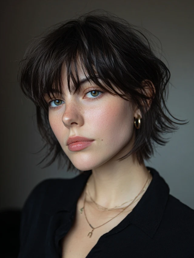 Short wolf cuts with curtain bangs work because the layered crown adds lift while the curtain bangs soften the forehead. The combination balances edginess with femininity.