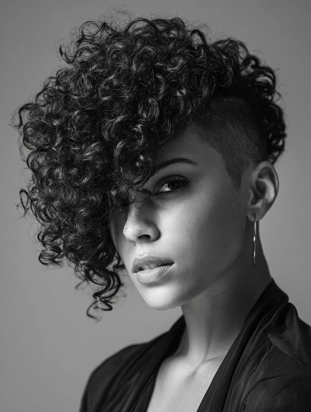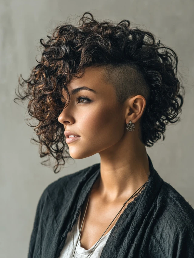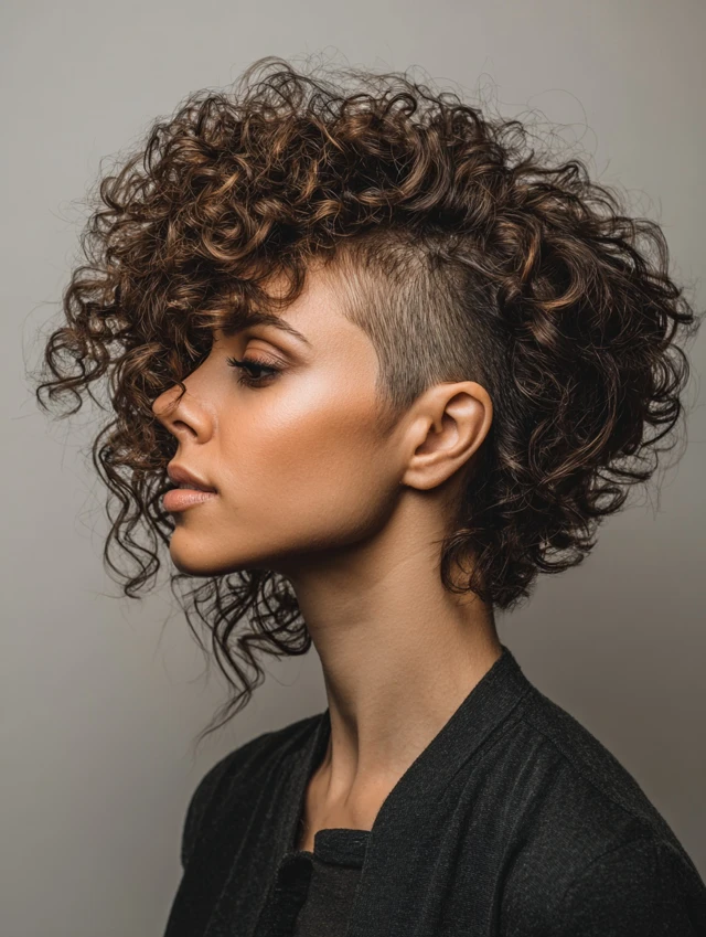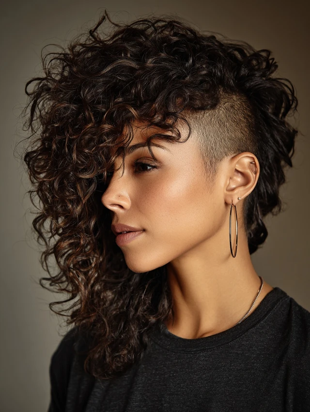 Curly side-shaves feature a shaved section paired with natural curls on the longer side, enhancing texture and movement. Works for oval, round, and heart-shaped faces. Medium to thick curly hair displays volume and layered texture beautifully.