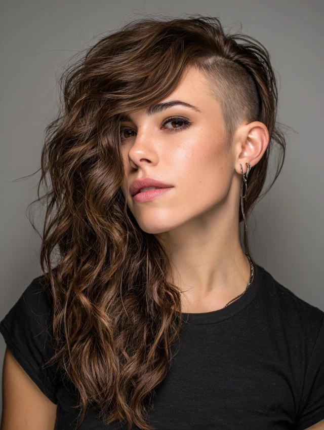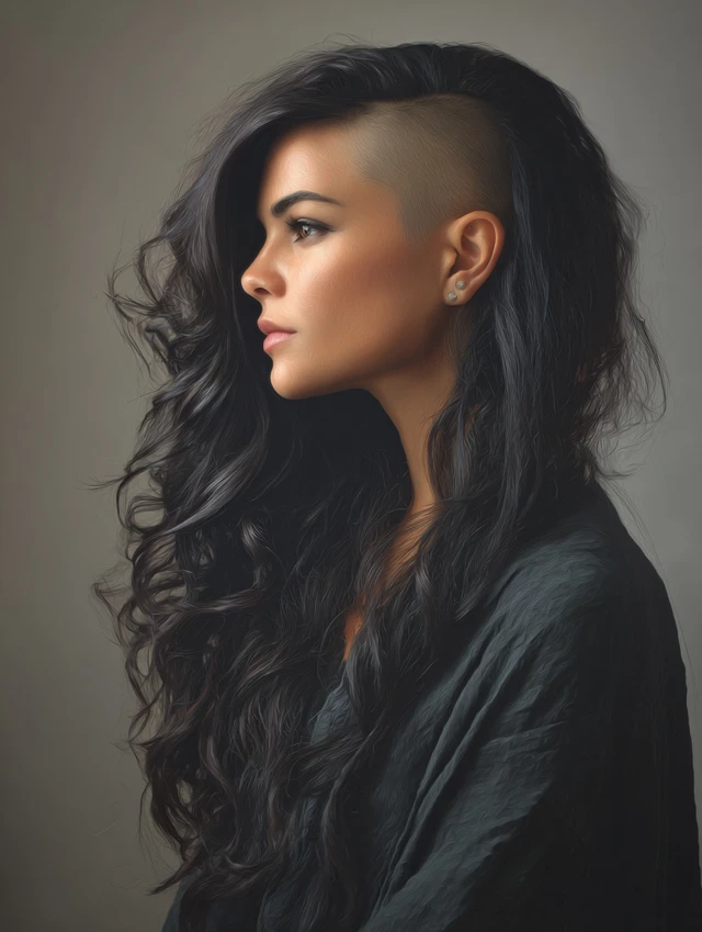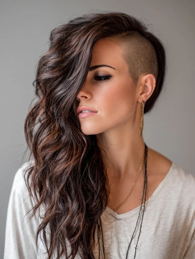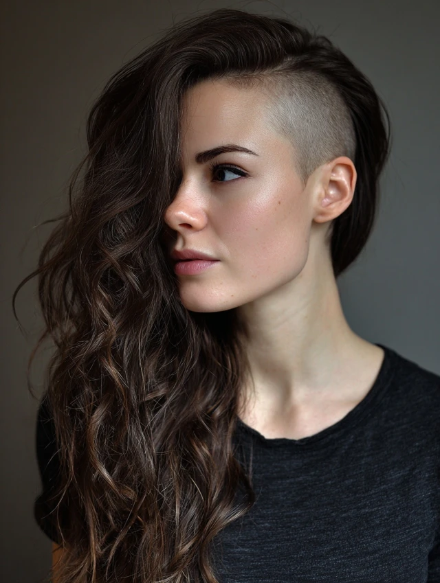 This style features a clean shaved section on one side with long, flowing hair on the other. Works well for oval, round, and heart-shaped faces. Medium to thick hair allows a dramatic contrast and natural volume.