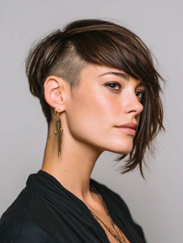 Undercut side-shaves keep the hair on top and one side longer while shaving the under section for subtle edge. Works for oval, round, and heart-shaped faces. Medium to thick hair showcases texture effectively.
