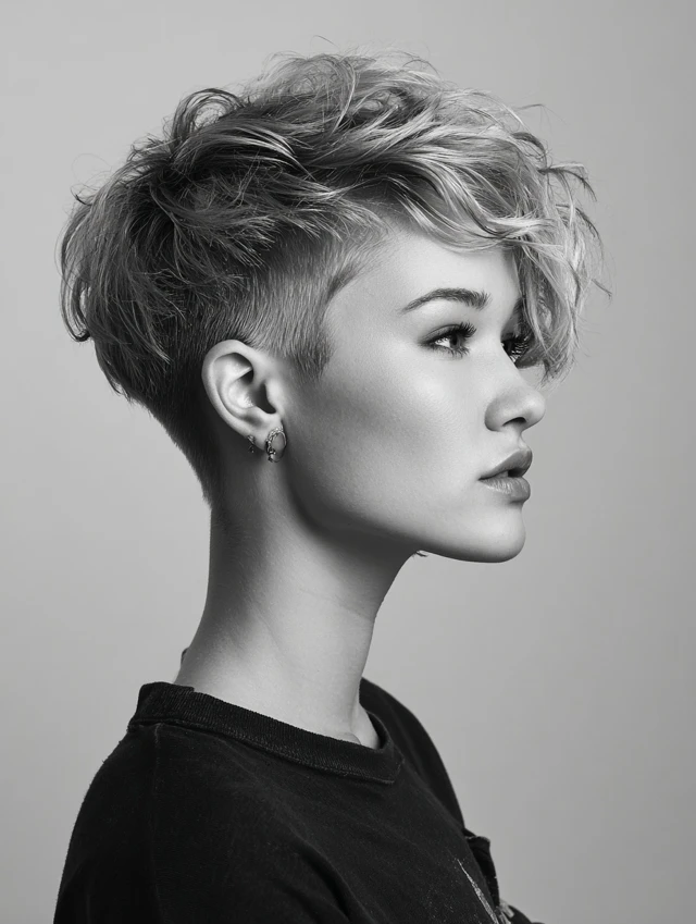 A side-shaved pixie keeps the crown short with one side shaved, creating a playful yet edgy look. Works for oval, round, and heart-shaped faces. Fine to medium hair responds well to this style.