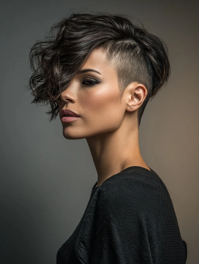Wavy side-shaved hair combines natural waves on the longer side with a bold shaved undercut. Works best for oval and square faces. Medium to thick wavy hair enhances texture and volume.