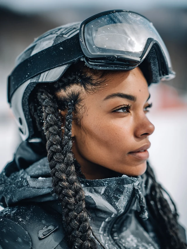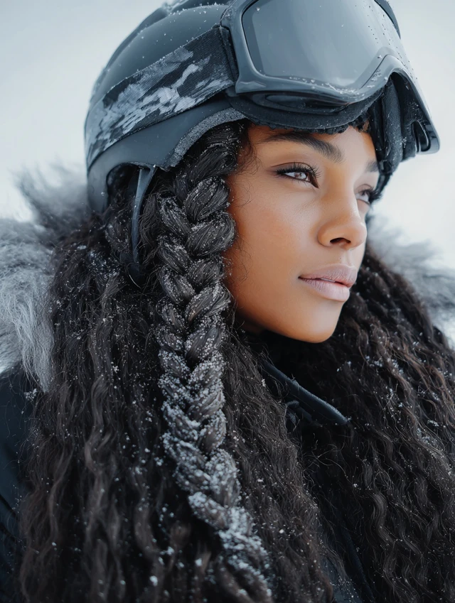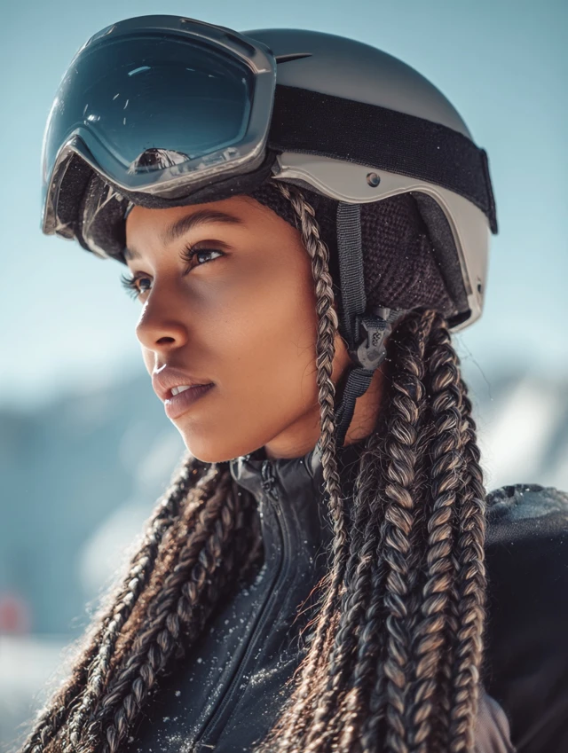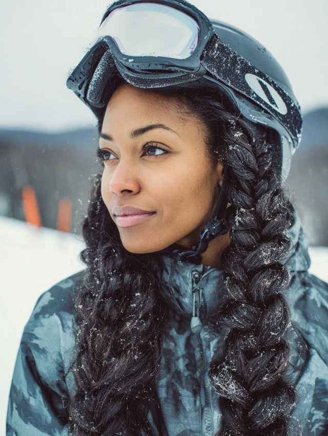 Oval and long faces benefit most. Works on medium to thick hair textures. Perfect for full-day skiing or snowboarding. Start braiding from the crown and secure with soft bands. Braids protect hair from wind and moisture while minimizing helmet friction.