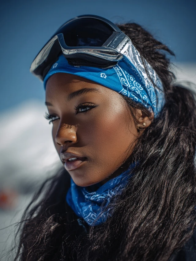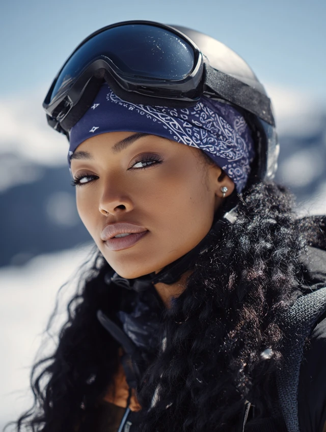 A mid-height ponytail wrapped in a bandana keeps hair compressed and adds extra warmth. The bandana prevents helmet friction and keeps hair smooth while skiing.