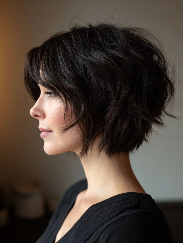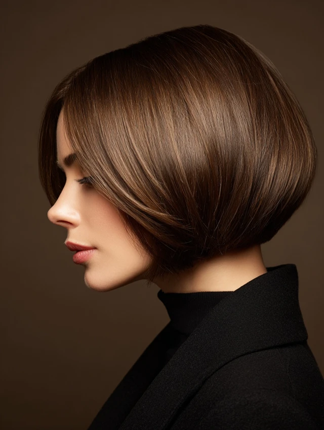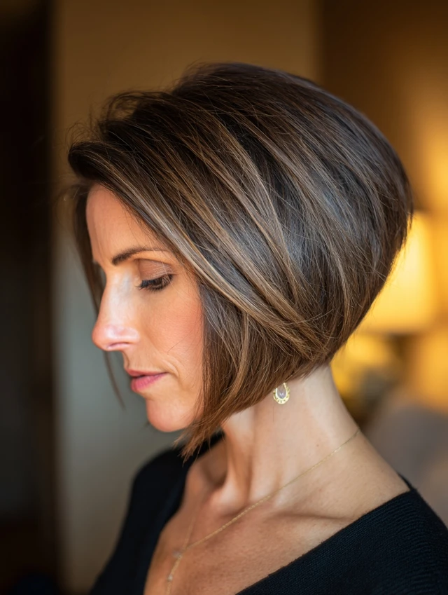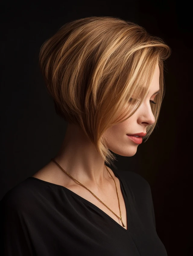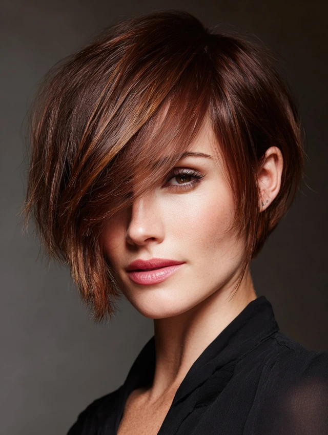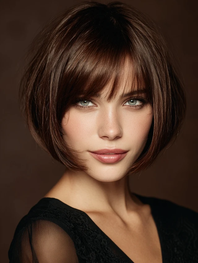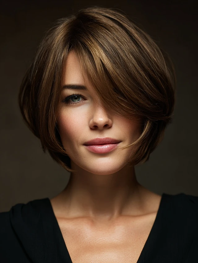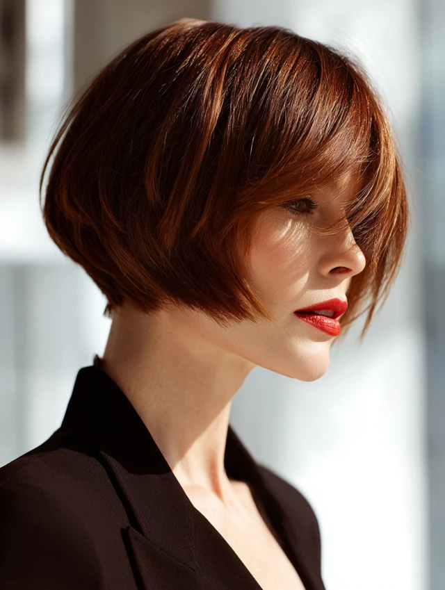 Adding side-swept bangs to a stacked bob softens the face and creates a youthful, elegant appearance. The layers blend seamlessly with the bangs for a cohesive look.