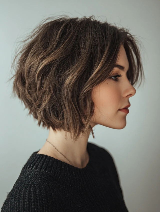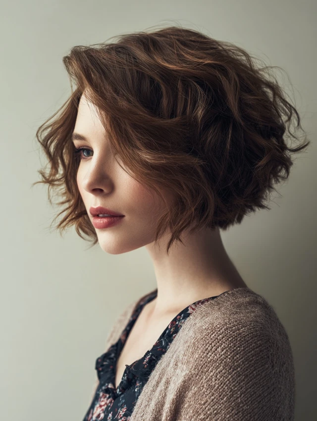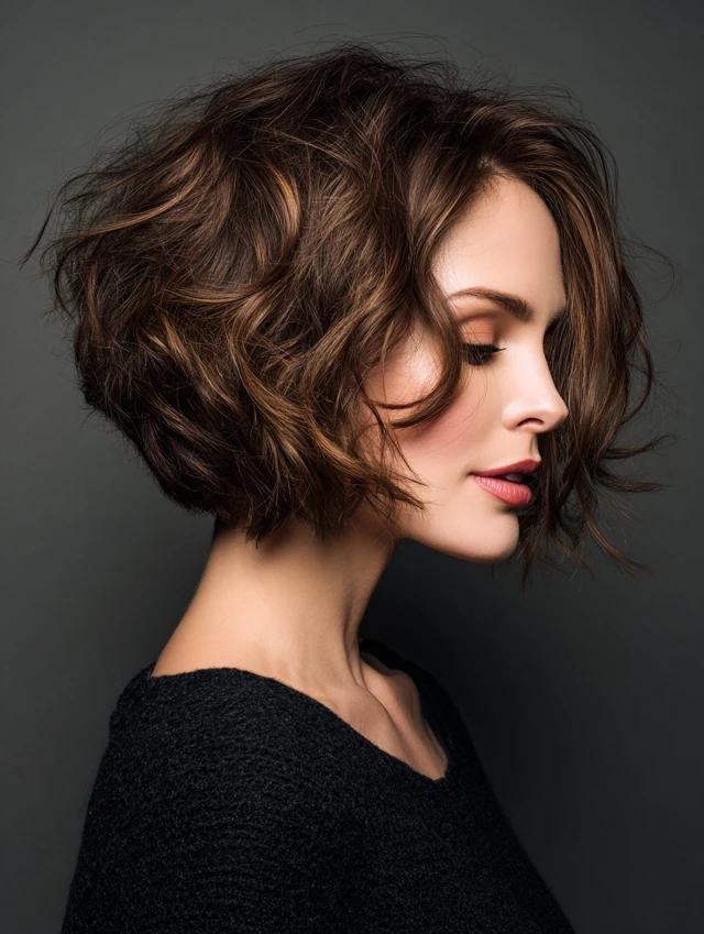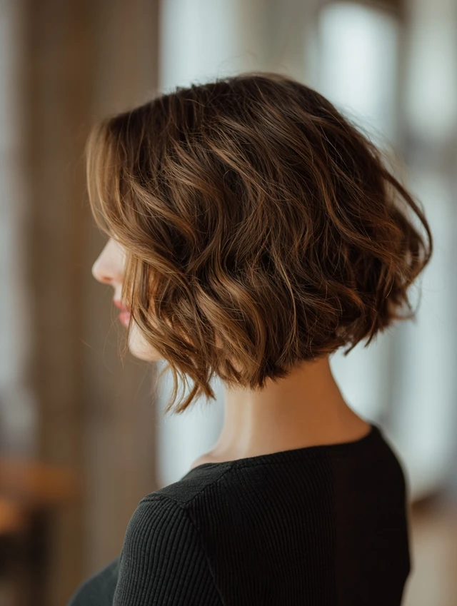 A wavy stacked bob incorporates loose waves with stacked layers for softness and dimension. The waves add body to fine hair while keeping the look playful.