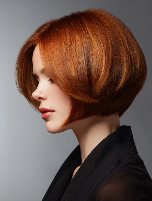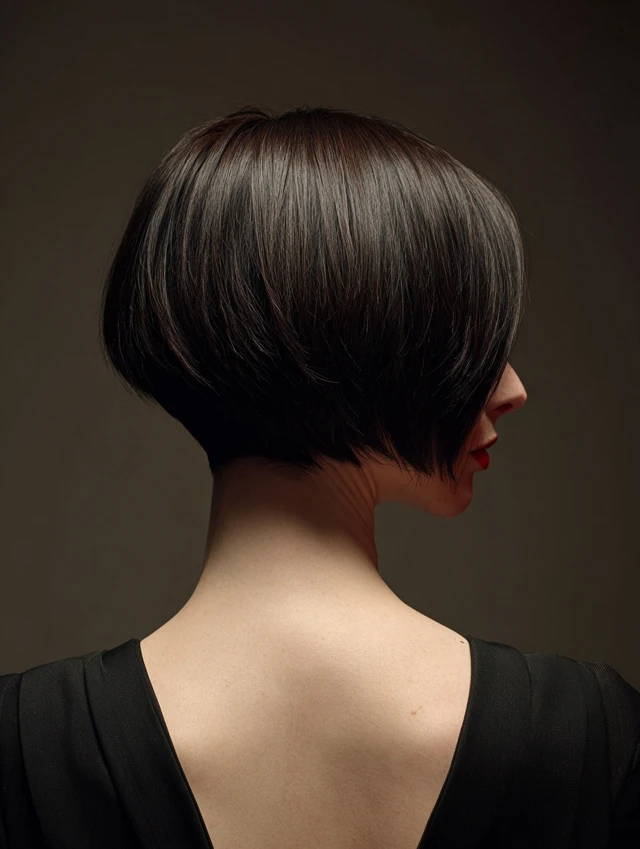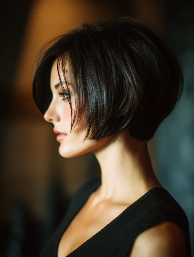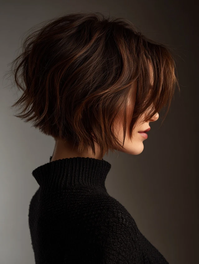 A short stacked bob is cropped close at the back with pronounced layers, creating maximum volume and lift. This cut is ideal for a bold, modern aesthetic.