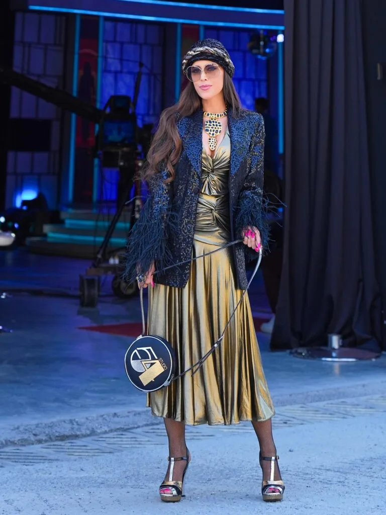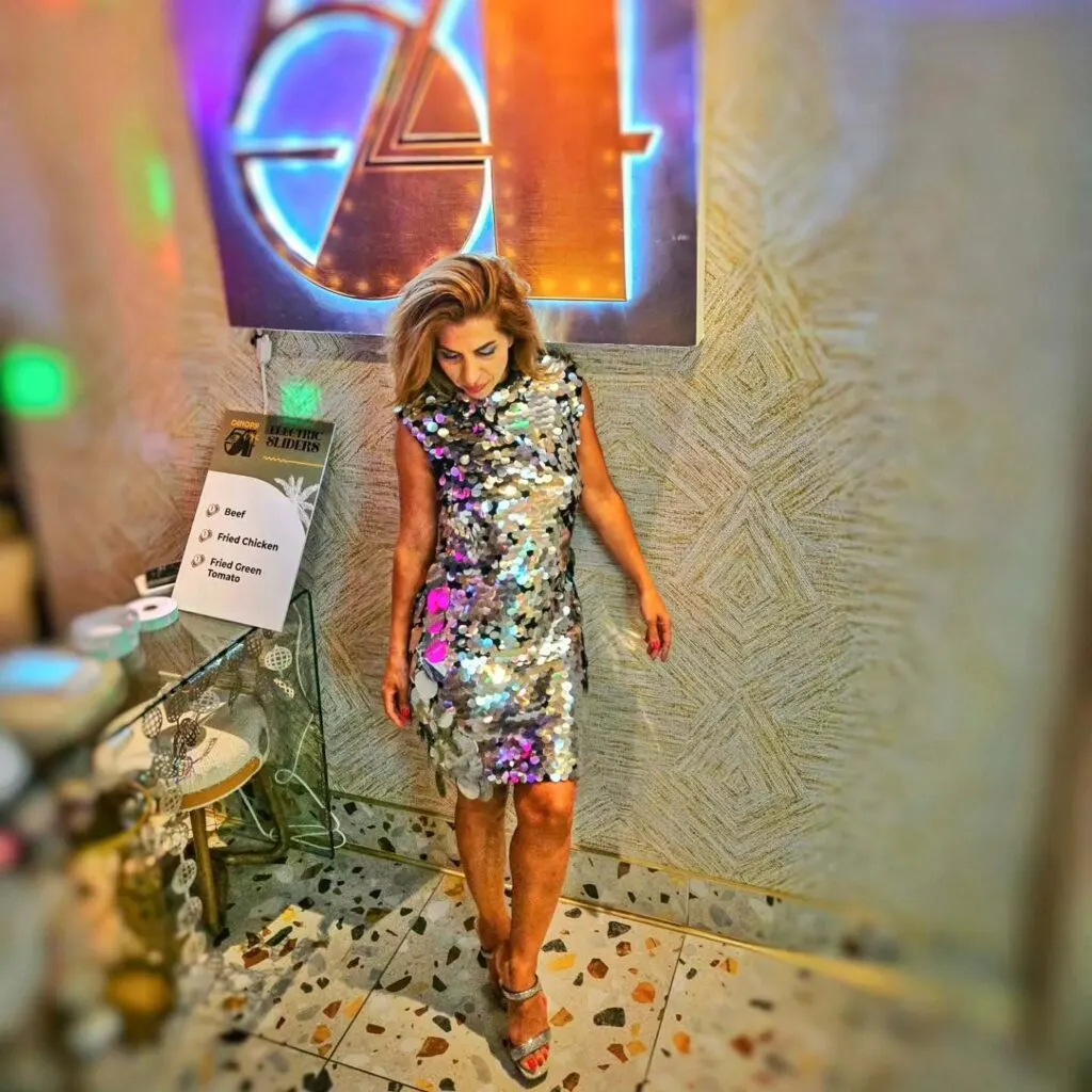 Paired with metallic platform sandals and pink socks, the styling adds quirky retro charm. Hair clips and a clutch complete the vintage-glam vibe. Fun, sparkly, and full of personality, this outfit channels disco spirit with a fresh twist.
